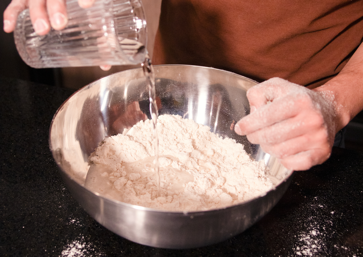 - Primero mezcla la harina con el agua fría. Procura que quede todo bien disuelto y sin grumos. Para evitar pelotitas de harina, tamízala previamente.