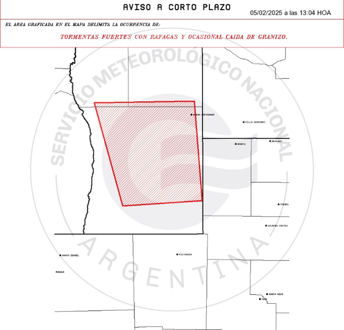 El Servicio Meteorológico Nacional realizó un aviso de corto plazo, su información tiene una validez de 3 horas y se emiten cuando las tormentas detectadas en el radar meteorológico muestran signos de severidad.