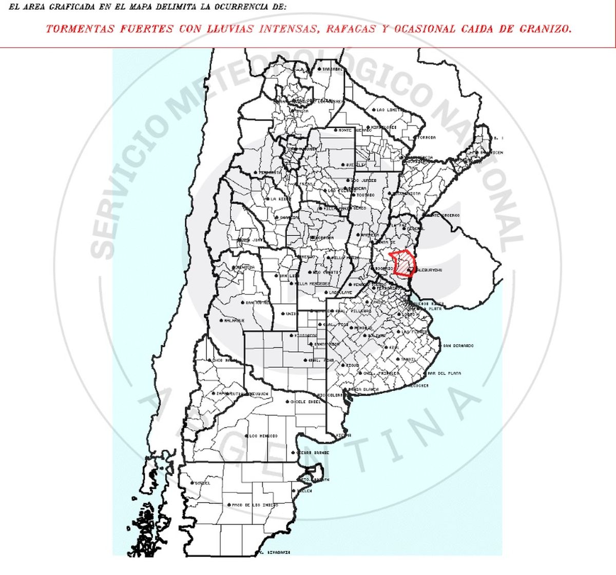 El Servicio Meteorológico Nacional en su página oficial emitió un alerta de corto plazo en donde la provincia de Entre Ríos se ve implicada por la caída de fuerte granizo. En las zonas de Colon, Concepcion del Ururguay, Gualeguay, Gualeguaychu, Islas del Ibicuy, Nogoya y Tala ocurriran fuertes lluvias con ráfagas y ocasional caída de granizo.