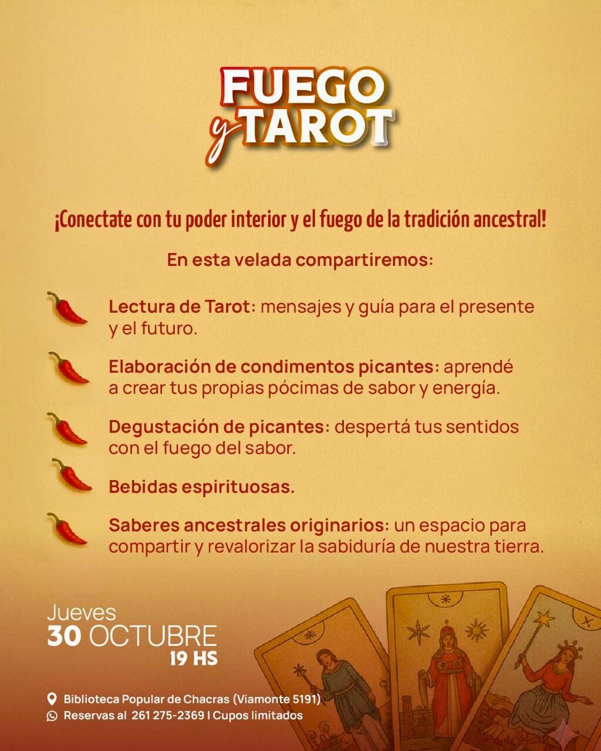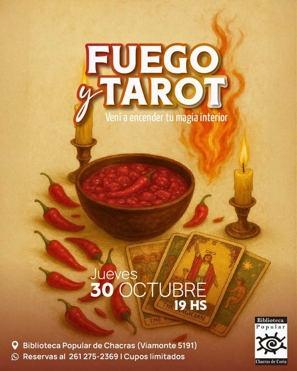 La Biblioteca Popular de Chacras de Coria será escenario de una propuesta distinta que combina fuego, saberes ancestrales y picantes sabores este jueves 30 de octubre, a las 19. “Fuego y Tarot” es la creación de dos emprendedoras locales: Natalia Ziperovich, productora de los aderezos picantes Rusa Coya, y Mónica Azaguate, tarotista de raíces huarpes.