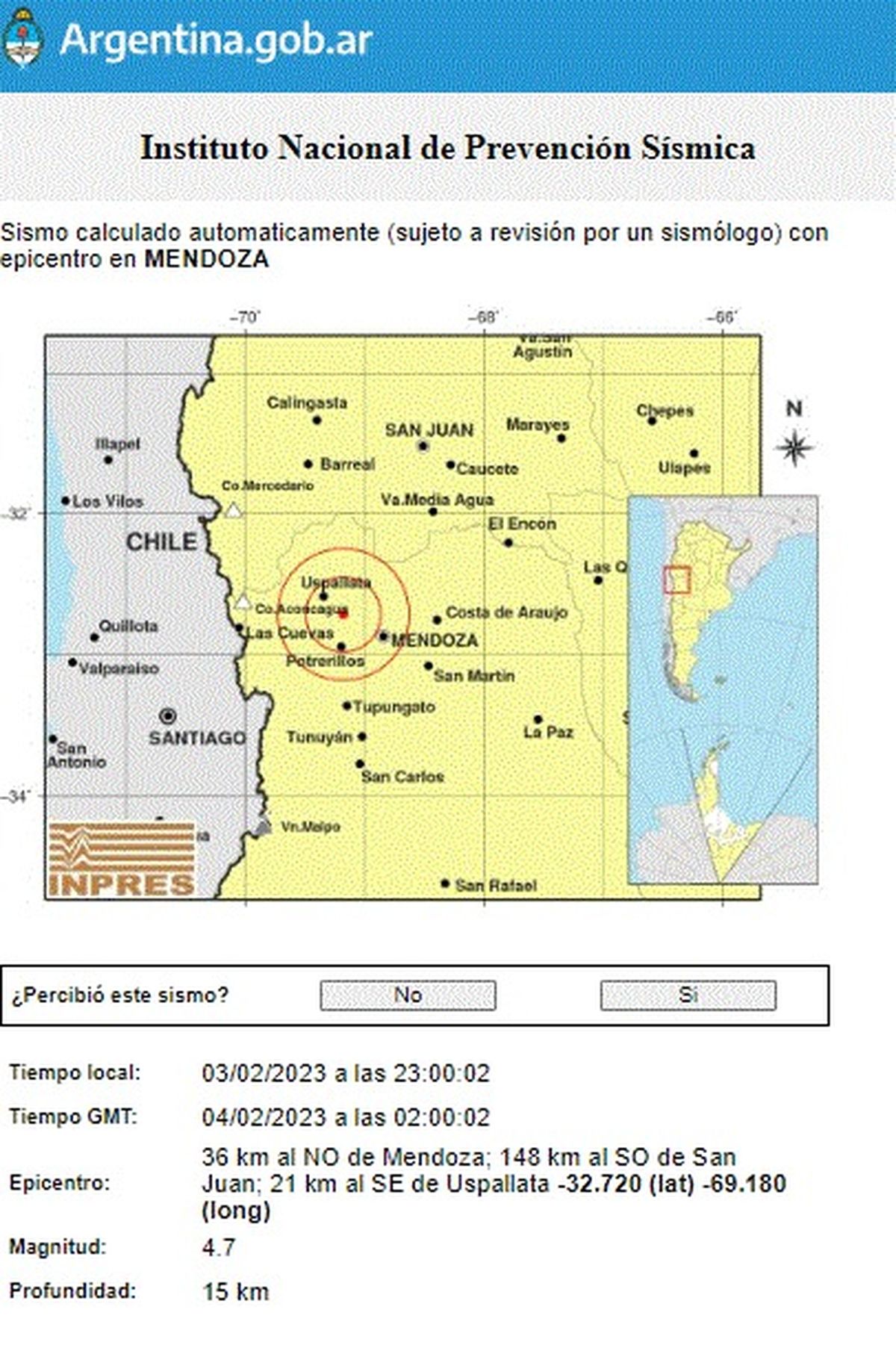 El movimiento sísmico se registró a las 23 y se produjo entre la Ciudad de Mendoza y Uspallata, a una profundidad de 14 kilómetros