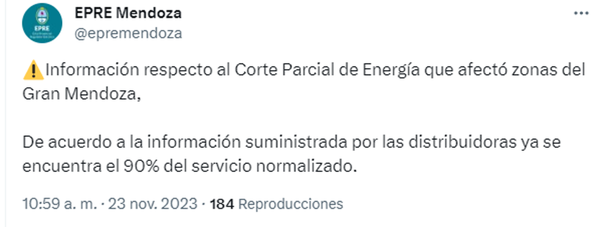 Una habla de "un problema aguas arriba"de la distribuidora de energía eléctrica; y hay un comunicado del Ente Provincial Regulador Eléctrico (EPRE) que se refiere a una falla en las redes de alta tensión de Distrocuyo.