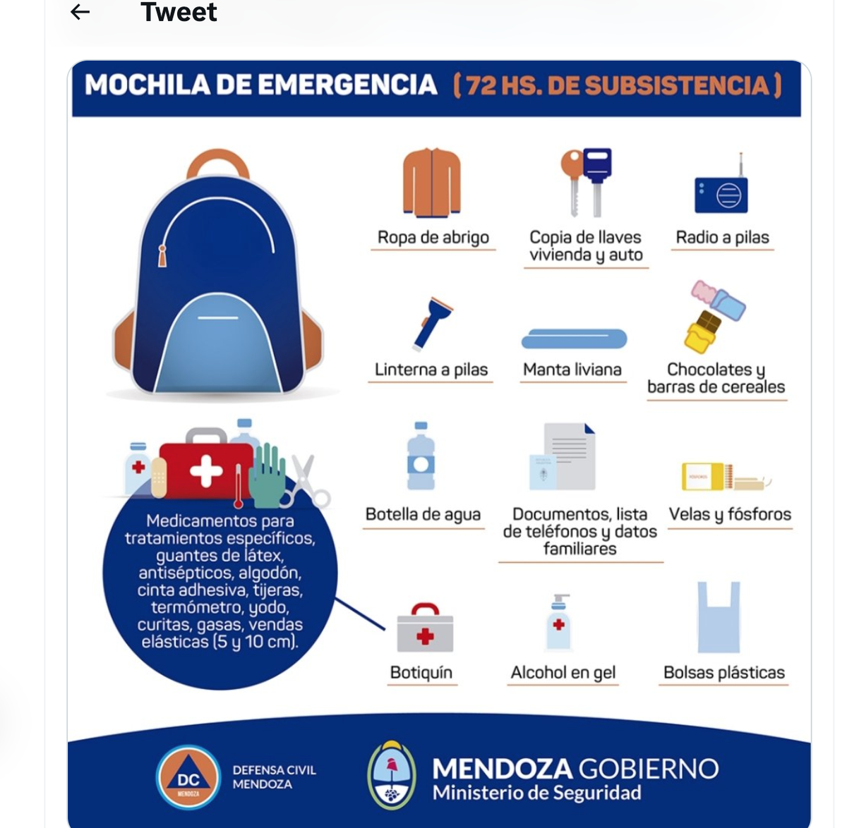 Los objetos que se debe tener son: recipiente con agua potable, alimentos no perecederos (como enlatados, arroz, alimentos secos, barras de cereal o chocolate -corroborar siempre fechas de vencimiento-); lista con teléfonos importantes de familiares, bomberos, hospital, 911; lista con nombres de nuestros familiares (DNI, grupo sanguíneo, obra social, medicamentos que toman); lista de nombres y teléfonos de familiares cercanos; botiquín de primeros auxilios con medicamentos vitales; radio a pilas; linterna y pilas; silbato y guantes; documentos personales y sus copias; ropa y manta de abrigo; kit de aseo y herramientas y alambre.