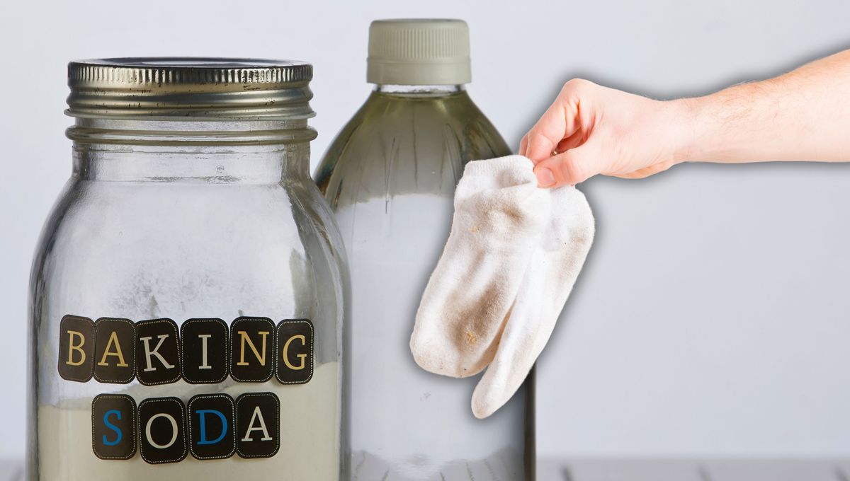 - Coloca las medias sucias dentro del frasco y espolvorea el bicarbonato de sodio.
