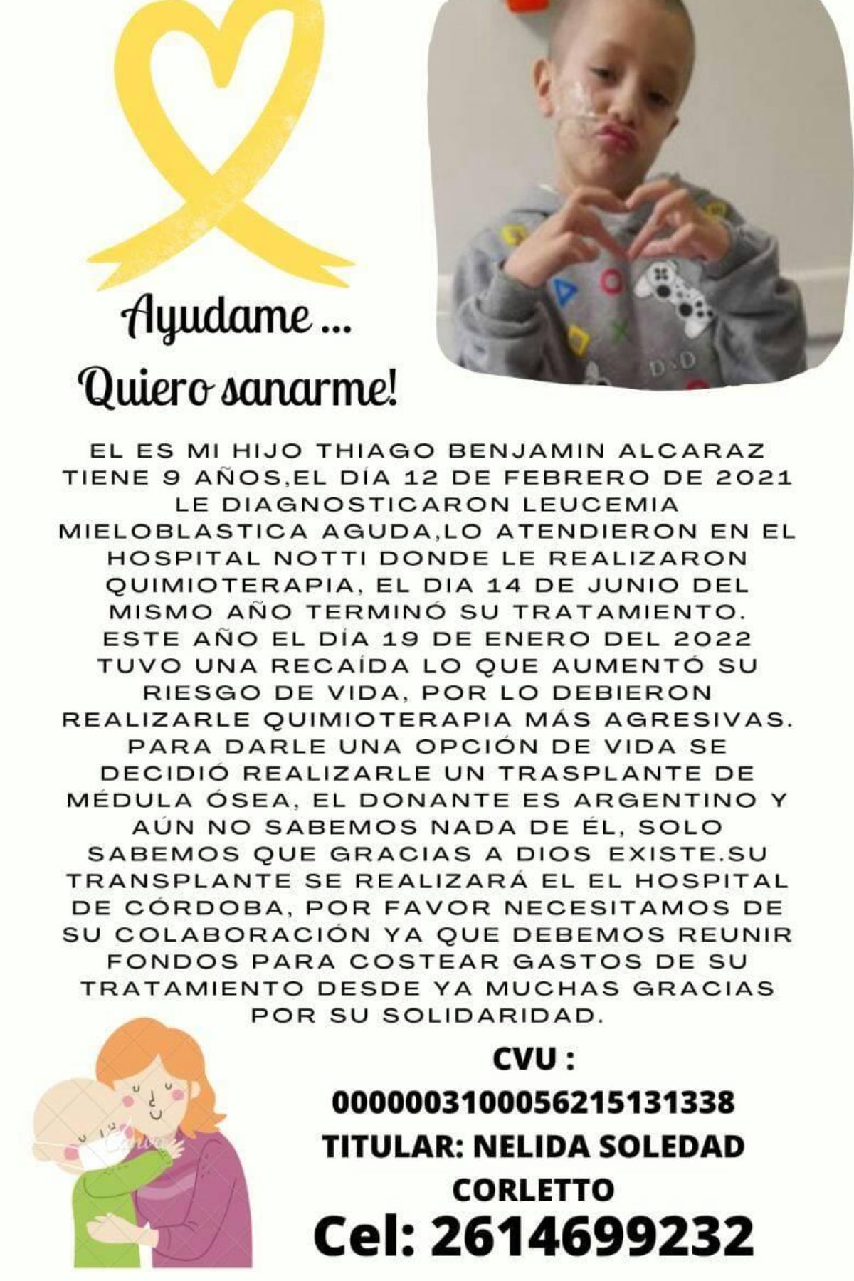 Thiago fue diagnosticado con leucemia a los ocho años (cumplió nueve este 7 de julio) en febrero del 2021. Se realizó un tratamiento de quimioterapia en el hospital Humberto Notti que finalizó en junio de ese años, pero en enero de este año tuvo la recaída que hace necesario el trasplante de médula ósea mencionado.