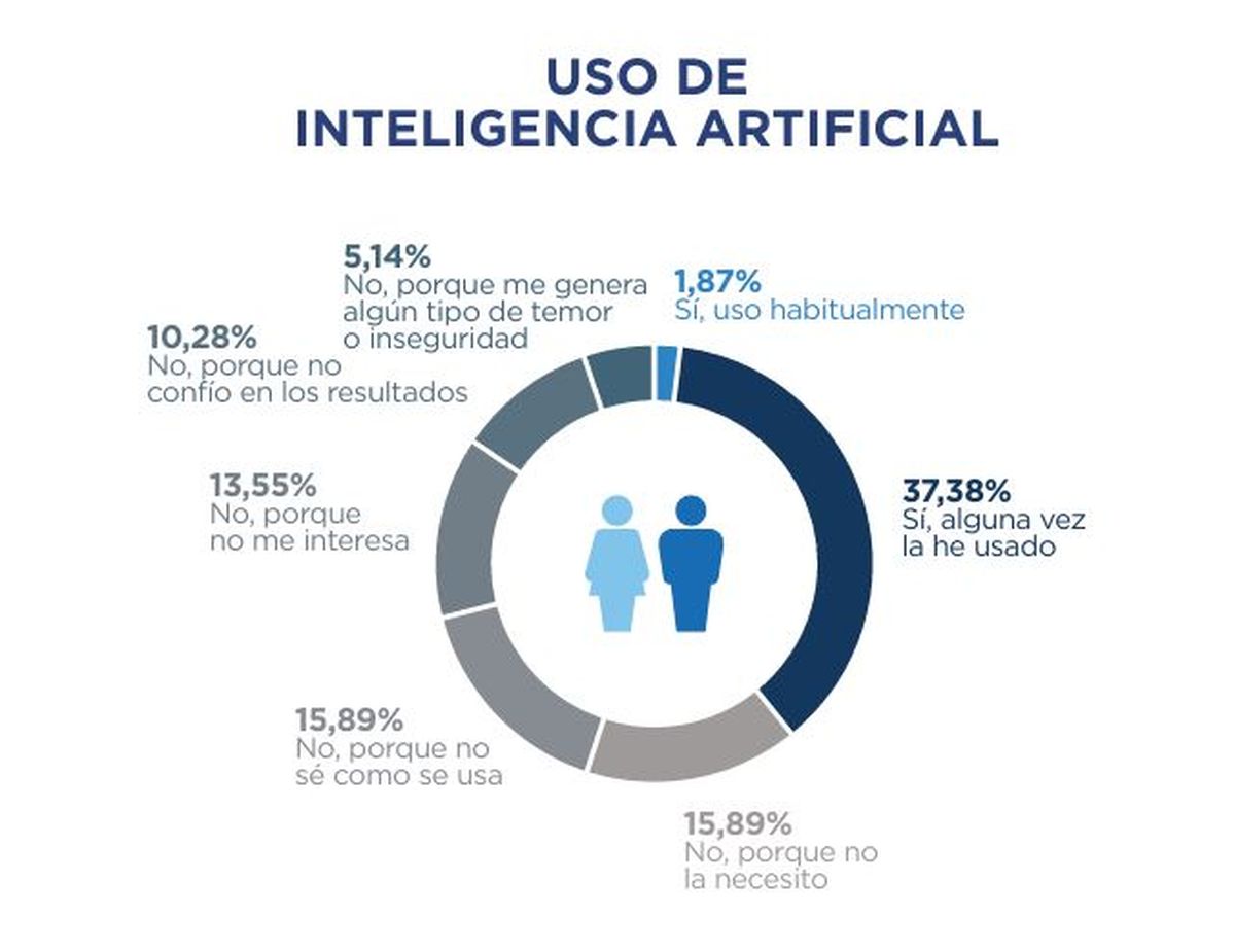 A pesar de que el término IA inunda las noticias, el dominio técnico en la provincia es bajísimo. Apenas el 1,87% de los mendocinos asegura saber "mucho" sobre el tema, mientras que un 43,9% directamente dice saber "poco". Esta falta de conocimiento se refleja en el uso práctico: solo un 1,87% la utiliza de manera habitual, frente a un 37% que la probó alguna vez y el 25% que jamás la utilizó.