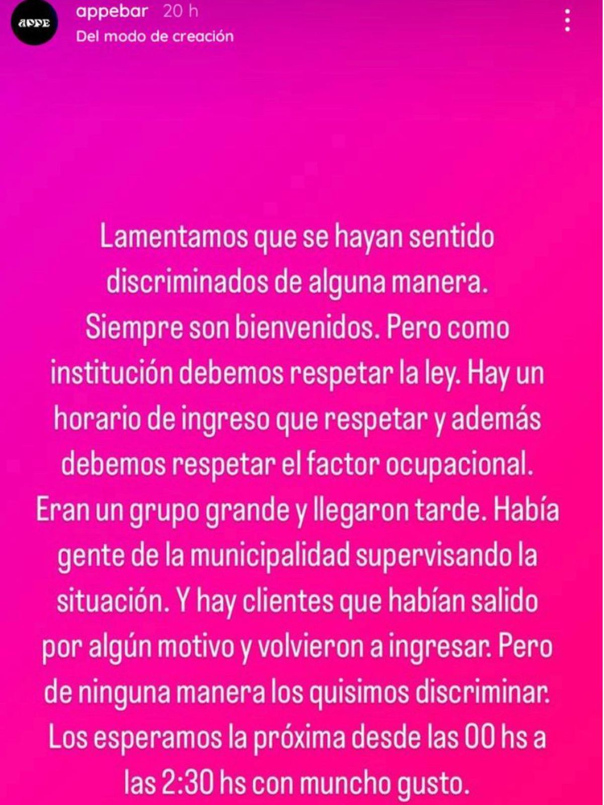 Desde la administración del local bailable, se intentó el contacto con los números telefónicos que figuran en las redes sociales del lugar y no hubo respuesta. De todos modos, desde la cuenta de Instagram hicieron un descargo, donde explicaron que no se trató de discriminación sino de una cuestión de horario, y que, si bien se vio ingresar gente más tarde de la hora en que quiso ingresar el grupo marginado, se debió a gente que había ingresado antes y había retornado.