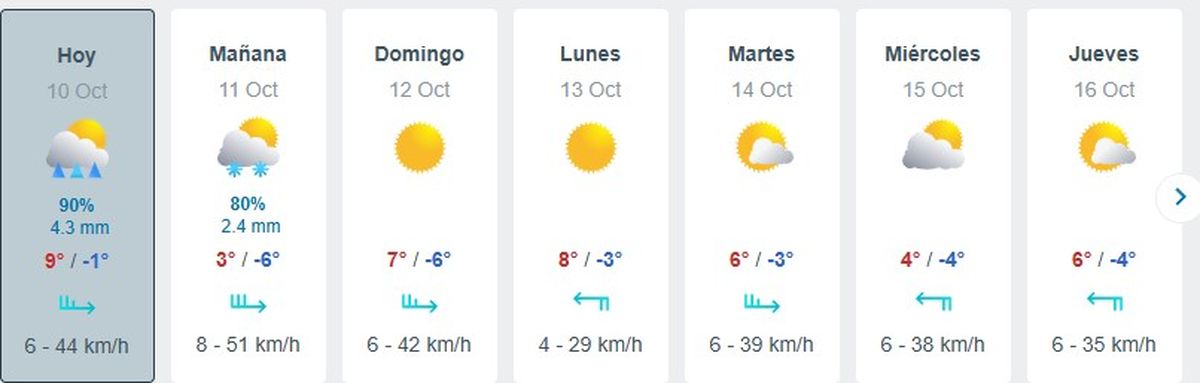 De acuerdo con la información aportada por el sitio Meteoreg, las máximas rondarán entre los 9°C y los 3°, con temperaturas bajo cero de mínima.