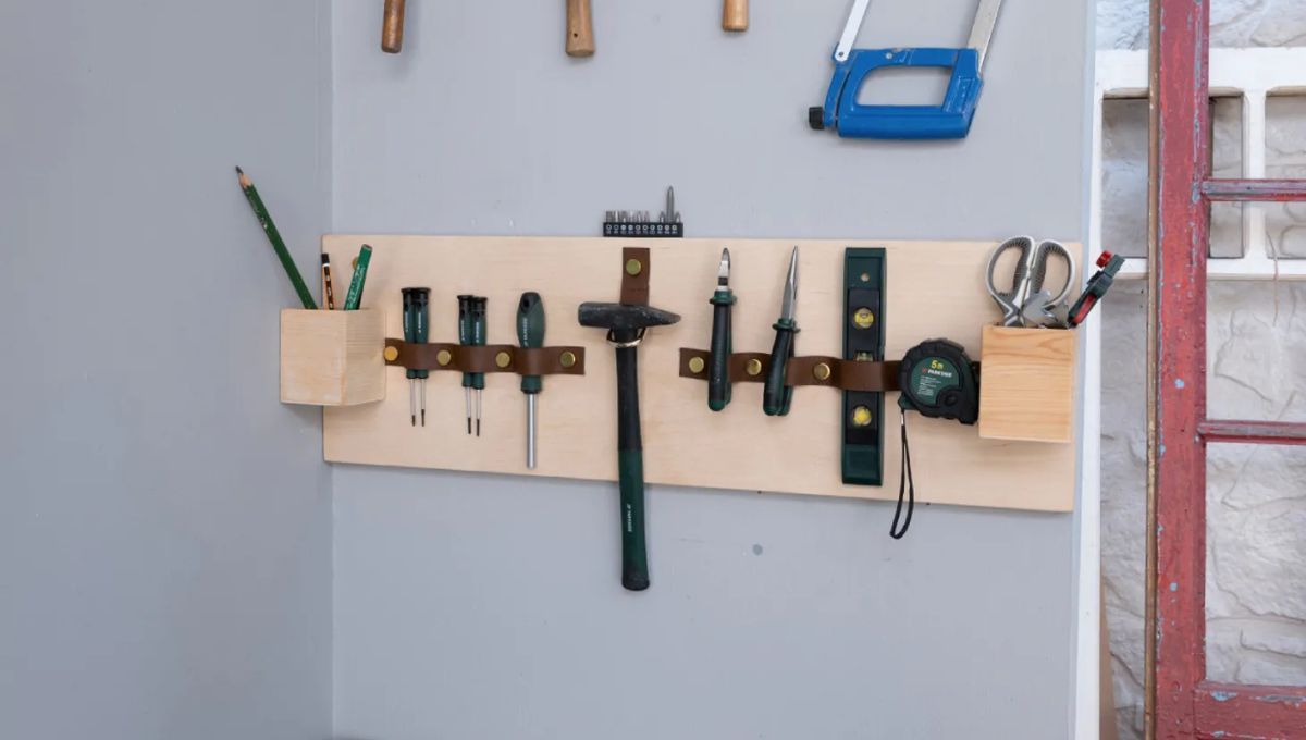 Con la ayuda de un punzón, perfora los puntos donde irán los tornillos y luego comienza a sujetar el cinturón al tablón de madera (también puedes añadir un puntito de cola de carpintero para que todo quede mejor sujeto antes de colocar los tornillos). Si lo deseas, puedes cubrir los tornillos con algunos tapones o elementos decorativos. Esto le brindará un acabado más limpio y profesional al organizador.