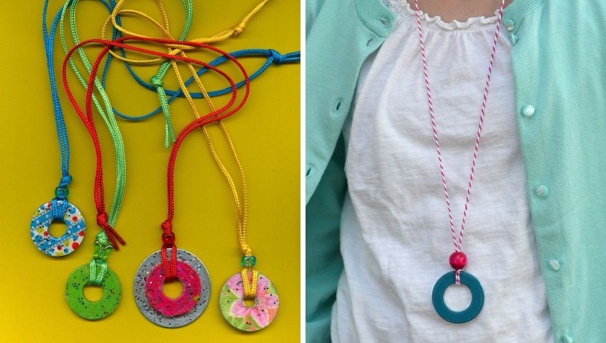 Usando una arandelas y un poco de cordón de colores, crea estos hermosos collares para las niñas