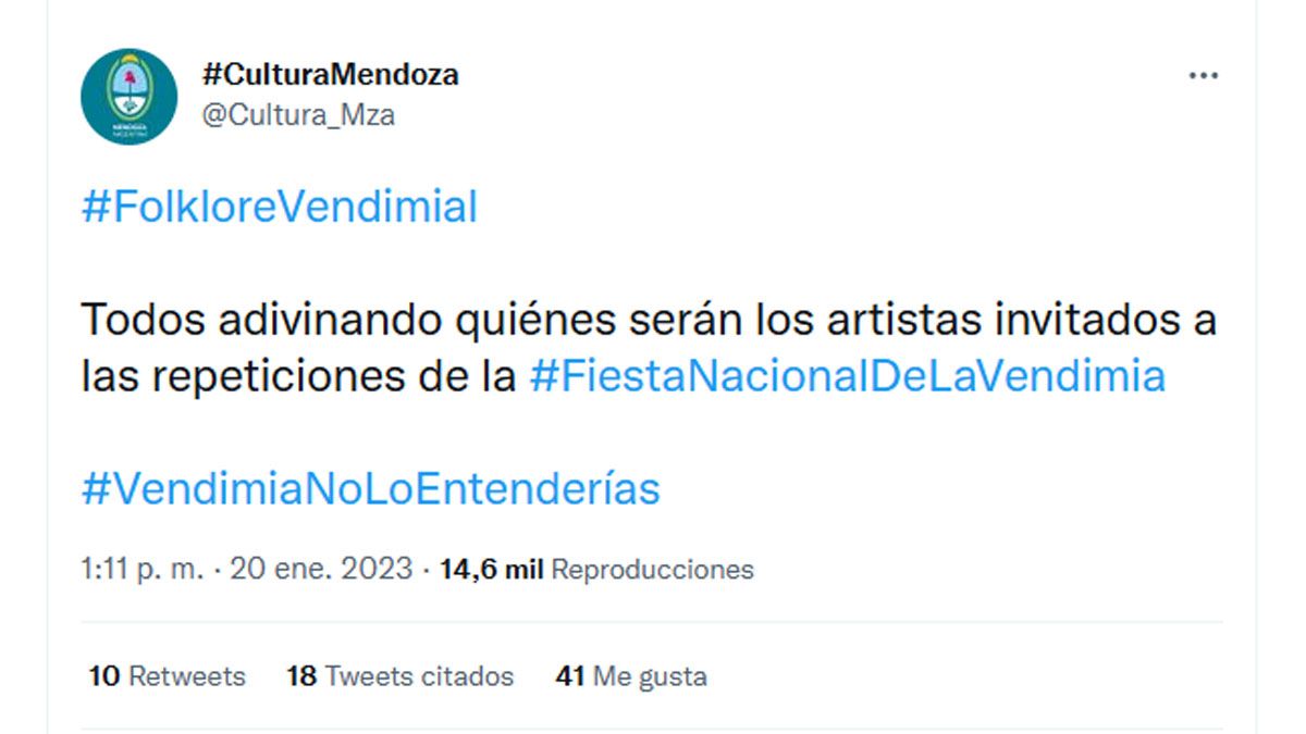 La ministra hizo el esperado anuncio por Twitter desde España, donde participa de la Feria Internacional del Turismo, minutos antes de llevarse adelante una conferencia de prensa para dar detalles de los artistas invitados para la primera y segunda repetición de la Vendimia 2023.