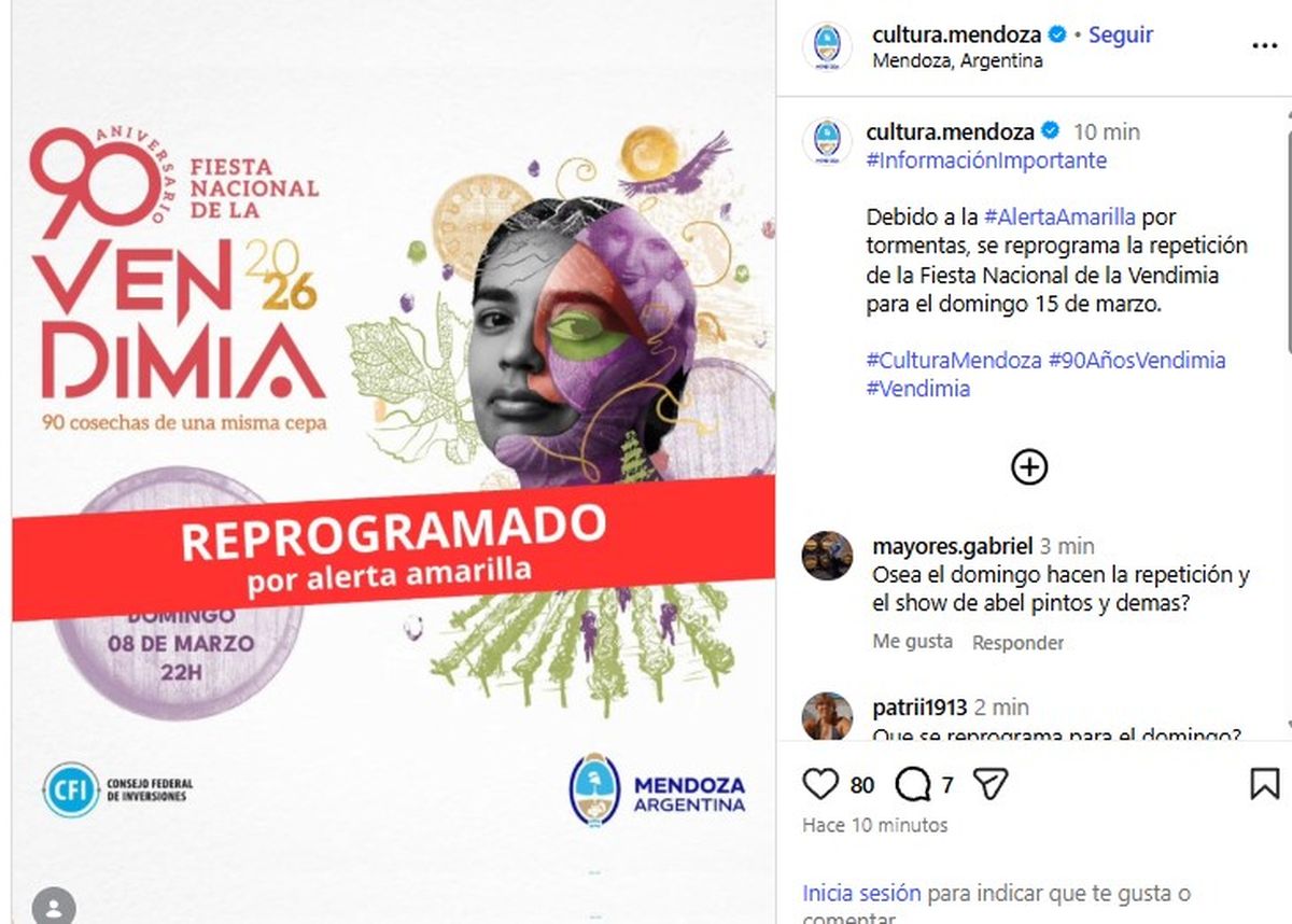 La organización de la Vendimia 2026 comunicó en las primeras horas de este miércoles 11 de marzo que no se hará en la jornada de hoy la repetición del Acto Central. Las malas condiciones del tiempo y un alerta amarilla, obligaron a trasladar el espectáculo para el domingo 15 de marzo, junto a la noche de Abel Pintos, que se suspendió este martes por las intensas tormentas.