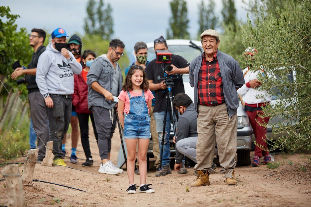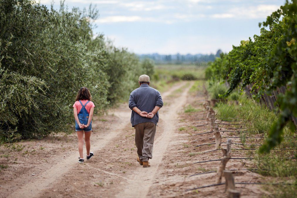 Hugo Luna (76), vecino de Las Heras y bailarín folclórico, es el abuelo que, entre las hileras de su finca, relata sus vivencias a su nieta, representada por Valentina Albornoz Baroffio (11).