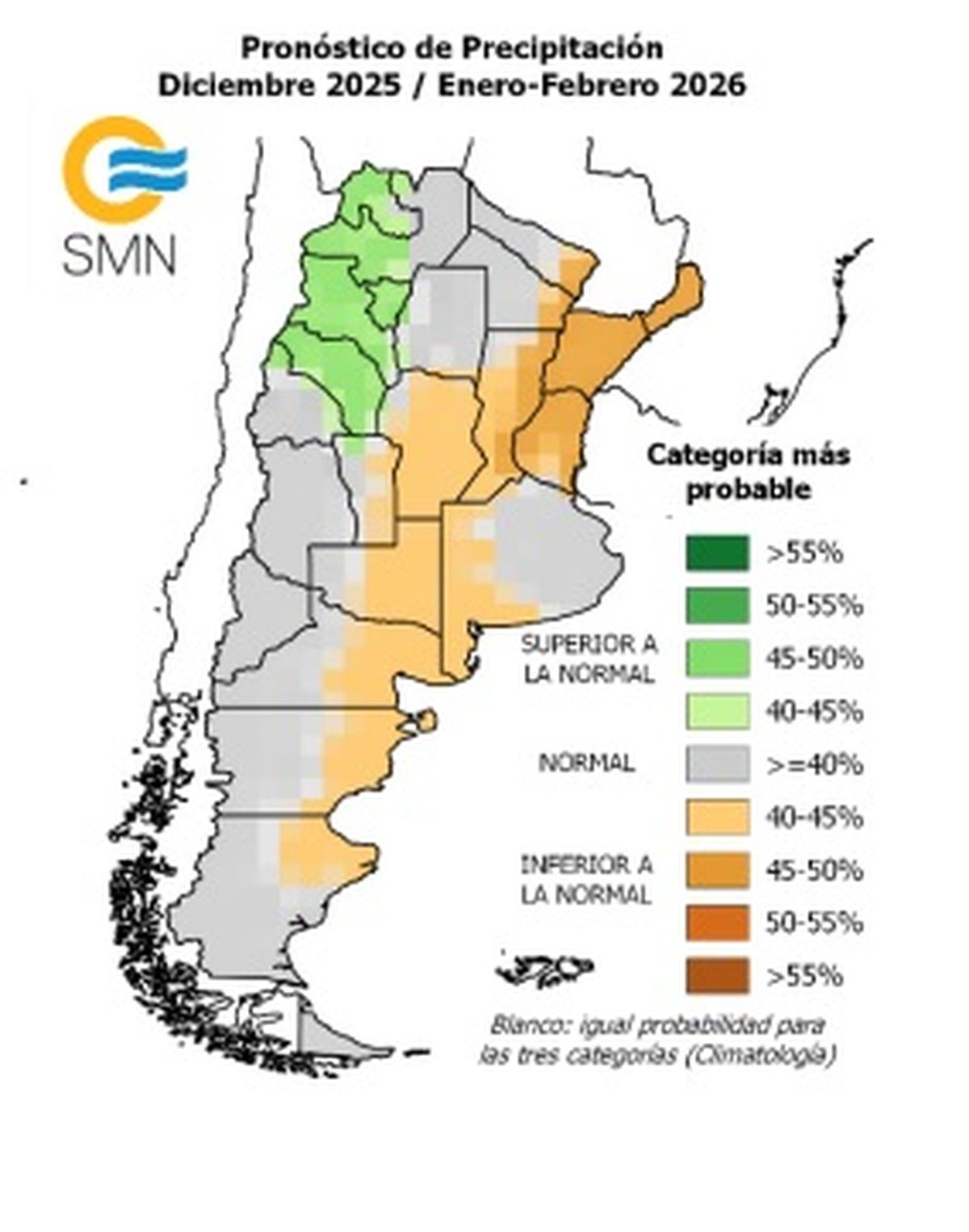 Se pronostican lluvias normales en el este de Salta, Formosa, Chaco, Santiago del Estero, Cuyo, este de Buenos Aires, oeste y sur de Patagonia. Normal o Inferior a la normal hacia el oeste de Santa Fe, Córdoba, este de San Luis, La Pampa, oeste de Buenos Aires y este de Patagonia.