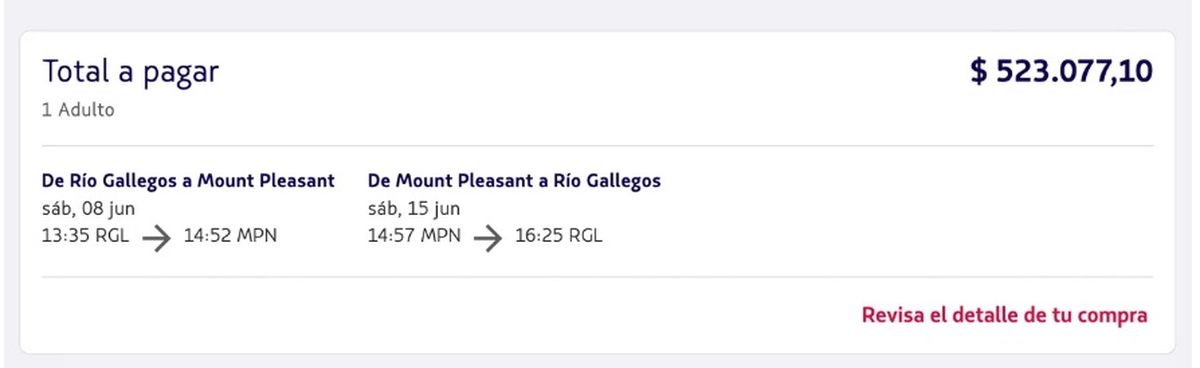 Actualmente, un vuelo ida y vuelta desde Río Gallegos hasta Mount Pleasant cuesta 523 mil pesos argentinos con impuestos incluidos, aunque si se desea salir desde la ciudad chilena de Punta Arenas ese monto asciende hasta los 750 mil pesos argentinos.