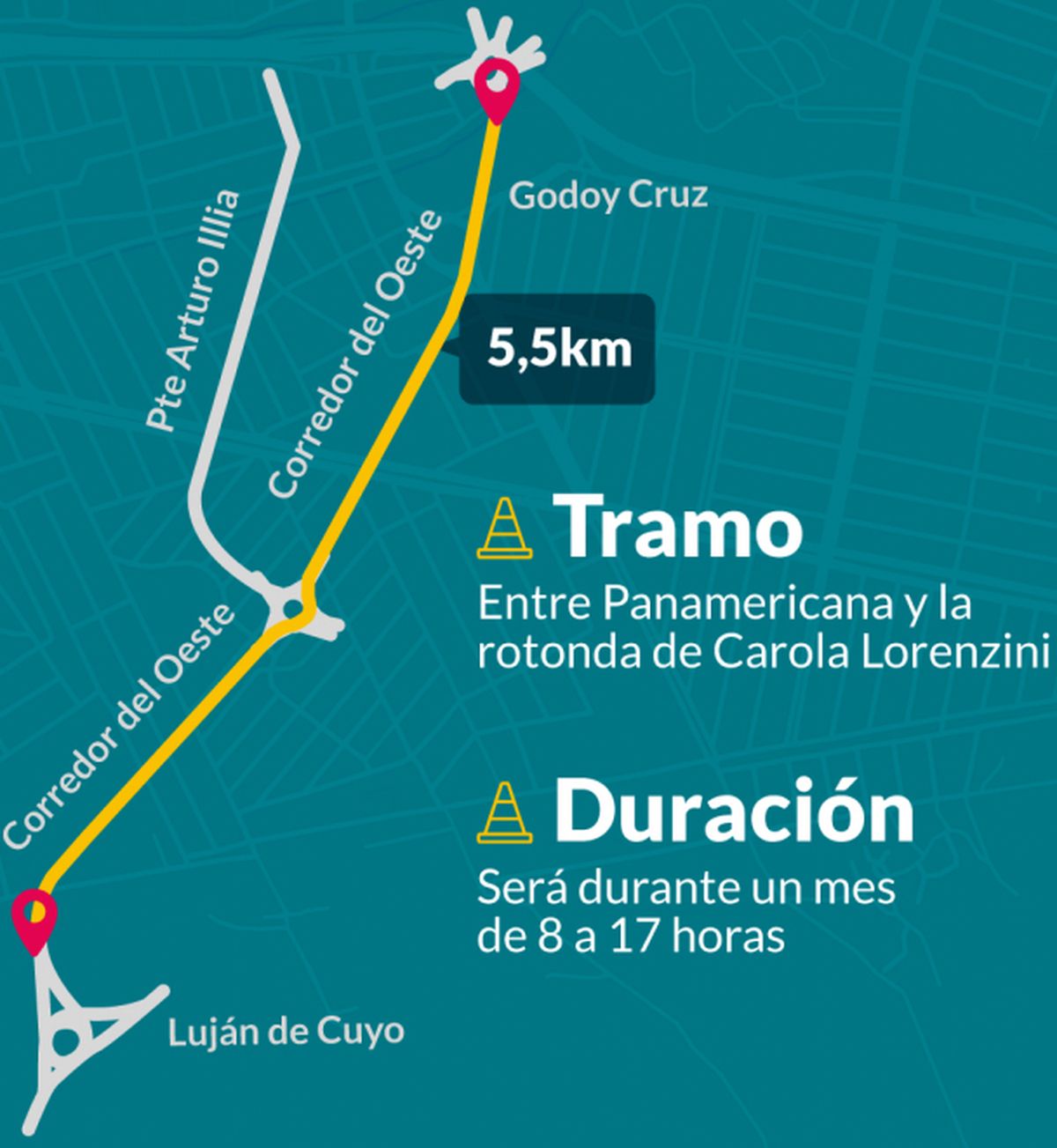 La obra que comenzará a las 8 de la mañana abarca las dos manos del tramo que se extiende entre el empalme con la Panamericana, en Luján, hasta la rotonda de Carola Lorenzini, en Godoy Cruz y quedaría concluida antes de fin de año, según informaron desde el organismo.