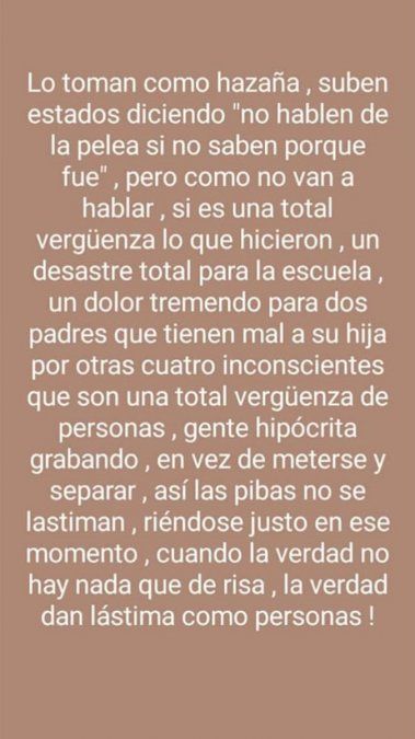 La agredida intenta reponerse y contestar el ataque, pero solo logra alimentar la furia de sus agresoras, quienes continúan golpeándola. Además se ve a otras alumnas, que son testigos de la situación y que no intervienen.