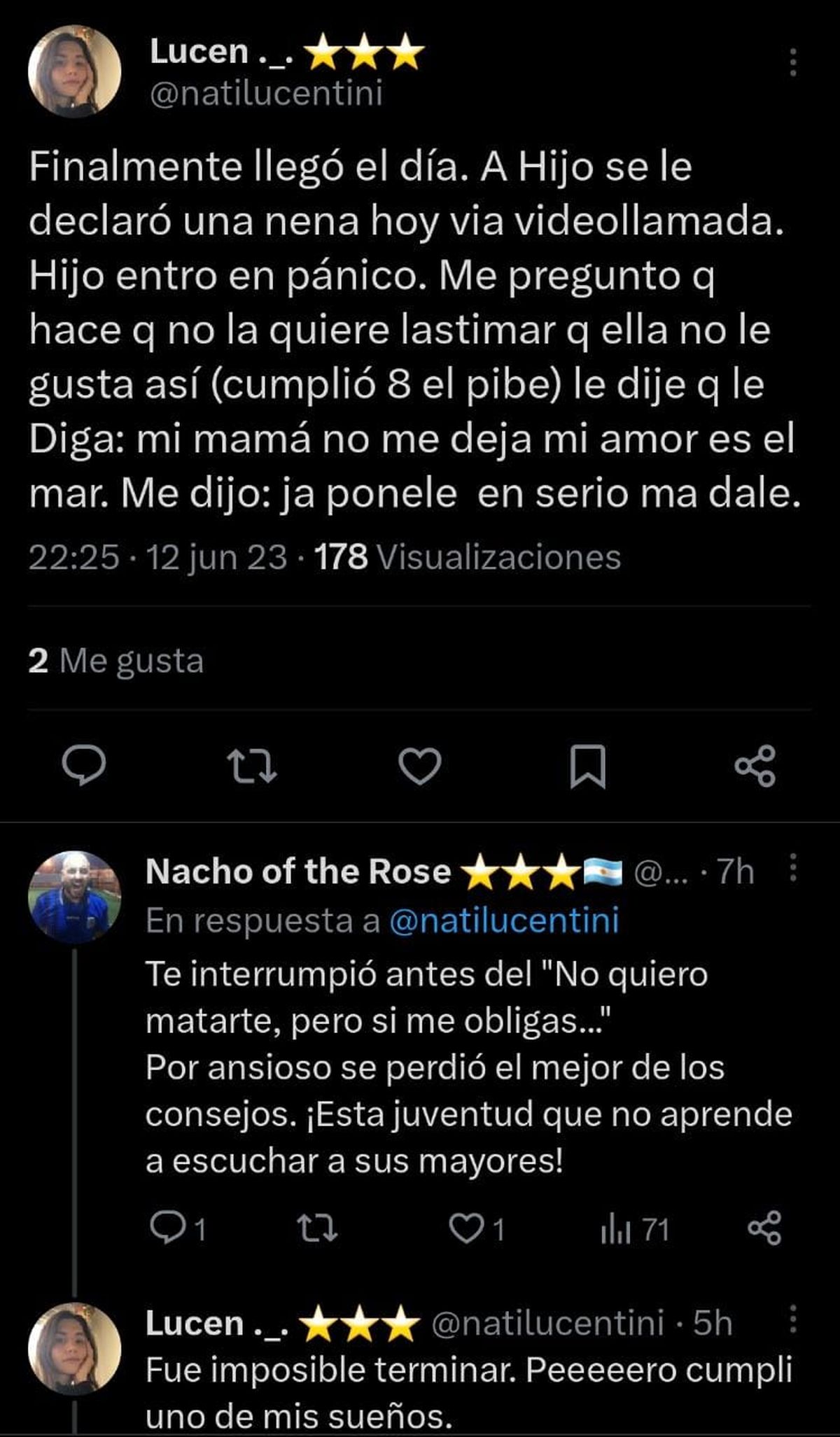 La chica continuó con una aclaración contundente: "Fue imposible terminar. Peeeeero cumplí uno de mis sueños". Sin embargo, no solo ella aspiraba a que ese día llegara para poder dar ese consejo a su hijo, sino también para el tuitero del primer comentario. "Jajajajaja. Cuando sea padre, me propondré metas similares...", coroló el chico.