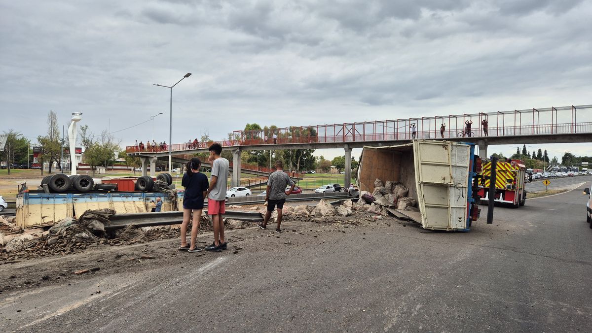 El camión, según explicó la periodista de Radio Nihuil, Paula Jalil, bajaba por Acceso Sur hacia el Este y en la curva del empalme para cambiar de vía desbarrancó el acoplado. La carga terminó impactando en una moto en la que iba una mujer, quien se luxó el tobillo izquierdo.