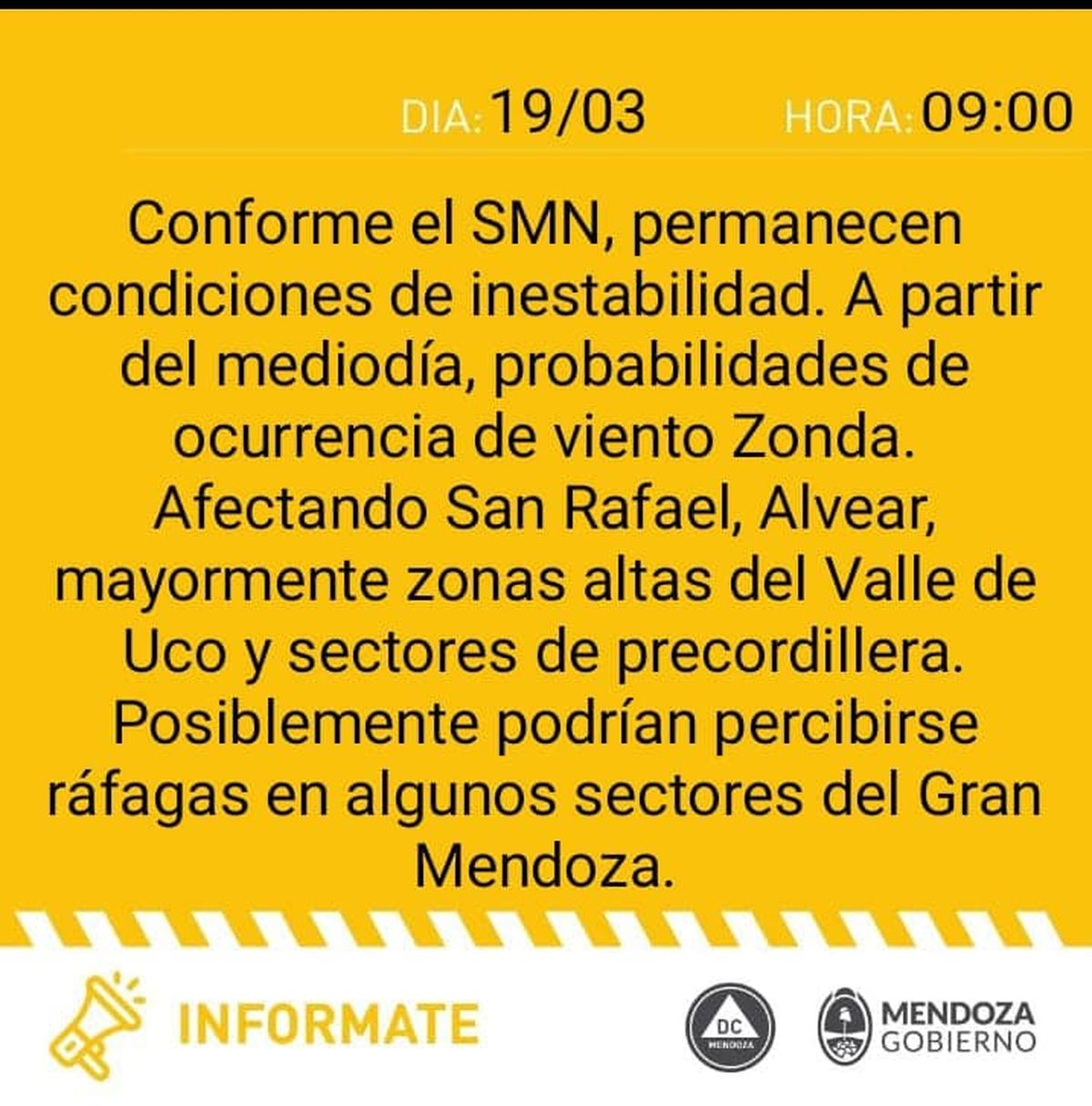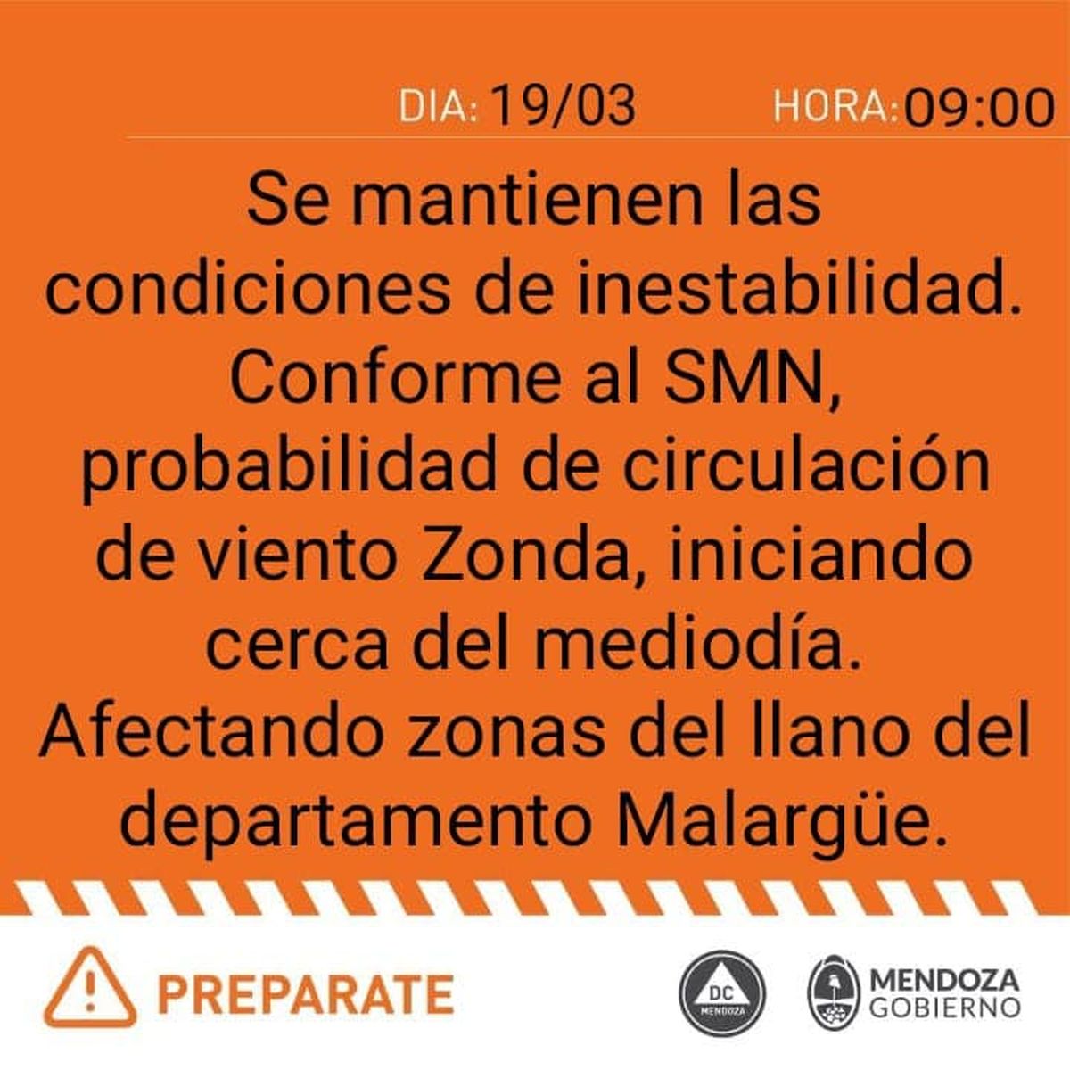 Por su parte, Defensa Civil emitió una alerta naranja en la que indicó la llegada del Zonda desde el mediodía en Malargüe, lo que significa que podría afectar la normal actividad en la sociedad.