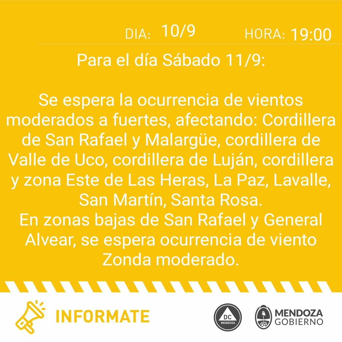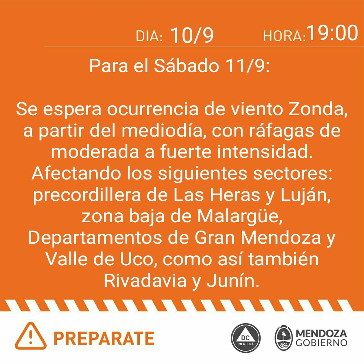 Por su parte, el meteorólogo Carlos Bustos, de Contingencias Climáticas, detalló a Canal 7 Mendoza: “La ocurrencia de Zonda será ente el sábado en la tarde noche y también el domingo hasta el mediodía, aunque más débil ya que serán restos de lo que quedaría del sábado, cuando podrá haber ráfagas a 55 kilómetros por hora”.