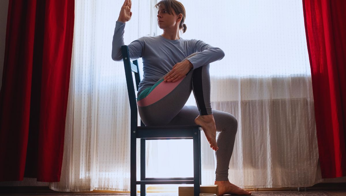 Este método consiste en realizar un ejercicio de torsión mientras te apoyas en una silla. Este es el paso a paso sobre cómo hacerlo: