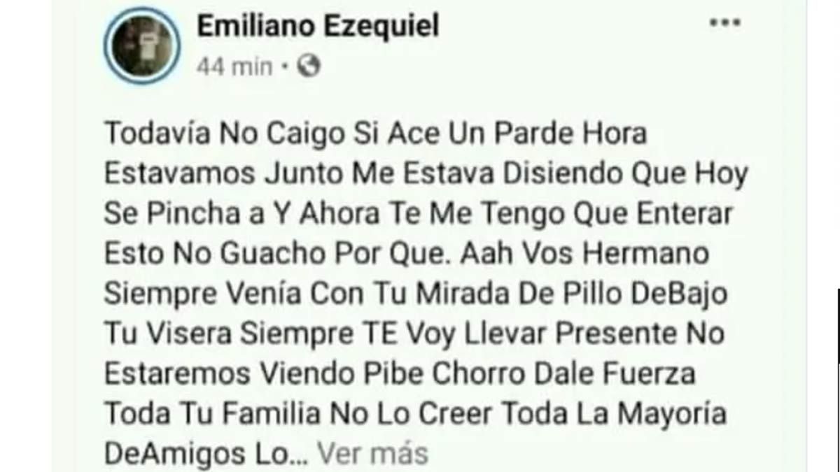 "Todavía no caigo si hace un par de horas estábamos juntos. Me estabas diciendo que hoy se pincha y ahora me tengo que enterar esto. Vos hermano siempre venías con tu mirada de pillo bajo tu visera. Siempre te voy a llevar presente. Nos estaremos viendo pibe chorro. Toda tu familia no lo puede creer. Fuerza", publicó en Facebook.