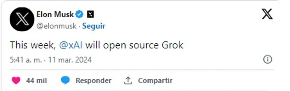 Elon Musk acaba de dar un inesperado golpe sobre la mesa anunciando que lanzará su IAGrok, en código abierto para la semana que viene. Un cambio bastante importante con respecto a las políticas que estaba llevando hasta ahora la empresa ya que iba a ser de código propietario y además contaría con una suscripción de unos 20 dólares en las que se incluiría también acceso a X Premium.