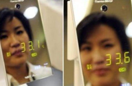 La temperatura se visualiza en el espejo, que también puede lanzar una alerta sonora paraseñalar la fiebre. El espejo termómetro cuesta alrededor de 1.100 dólares, un precio diez vecesinferior al de los termográficos utilizados en los lugares públicos como los aeropuertos, indicó elfabricante, que aspira a vender unas 5.000 unidades por año.