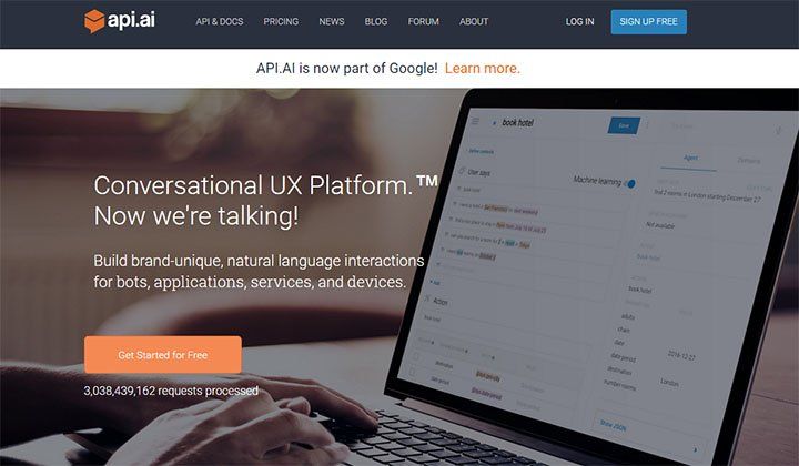 API.AI -una compañía estadounidense fundada en 2001- es una plataforma de experiencia de conversación destinada a bots (sistemas conversacionales que imitan comportamientos humanos), aplicaciones y servicios.