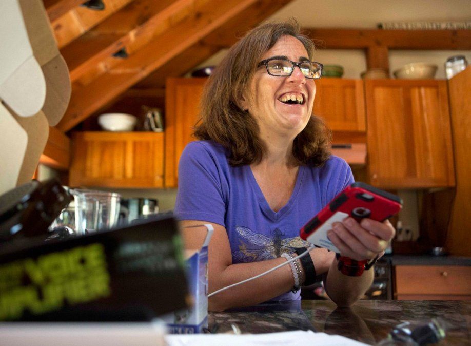 Algunos dispositivos de voz son controlados con el movimiento de las pupilas de los ojos o de la cabeza. Delaney Supple escribe las palabras en una tableta y al tocar un comando se convierten en audio.