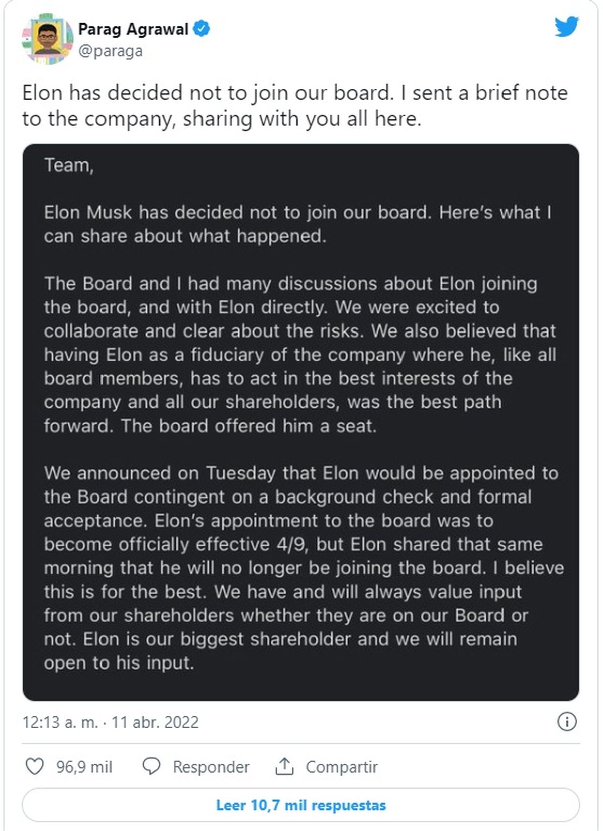 La noticia fue confirmada por el consejero delegado de Twitter, Parag Agrawal, mediante un tweet. “Elon ha decidido no unirse a nuestra junta”, comunicó durante la noche de este domingo. Musk debería haber ingresado en la junta directiva y catalogado como miembro oficial de Twitter el sábado último.