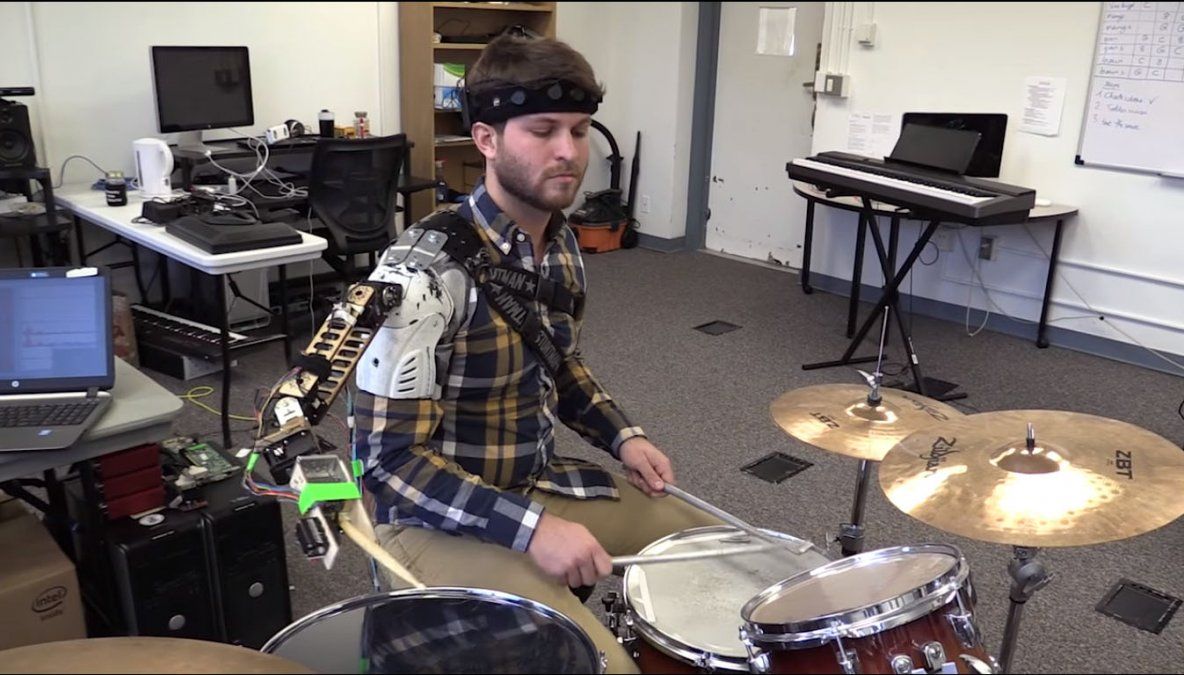 El "brazo robótico inteligente" se une al hombro del baterista y es capaz de responder tanto a los movimientos del baterista como a los la música que se está reproduciendo.