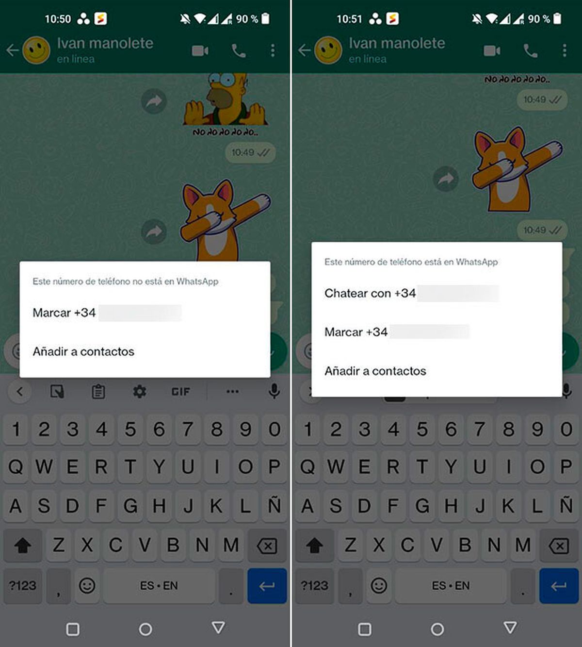 - Chatear con: que abre un chat con ese número, sin tener que añadirlo a los contactos.
