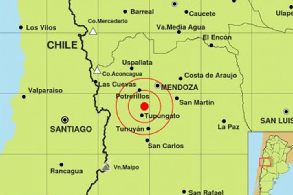 El epicentro se encontró a 45 km al SO de Mendoza, 197 km al S de San Juan, 16 km al N de Tupungato. -33.217 (lat) -69.098 (long), según indicó el INPRES.