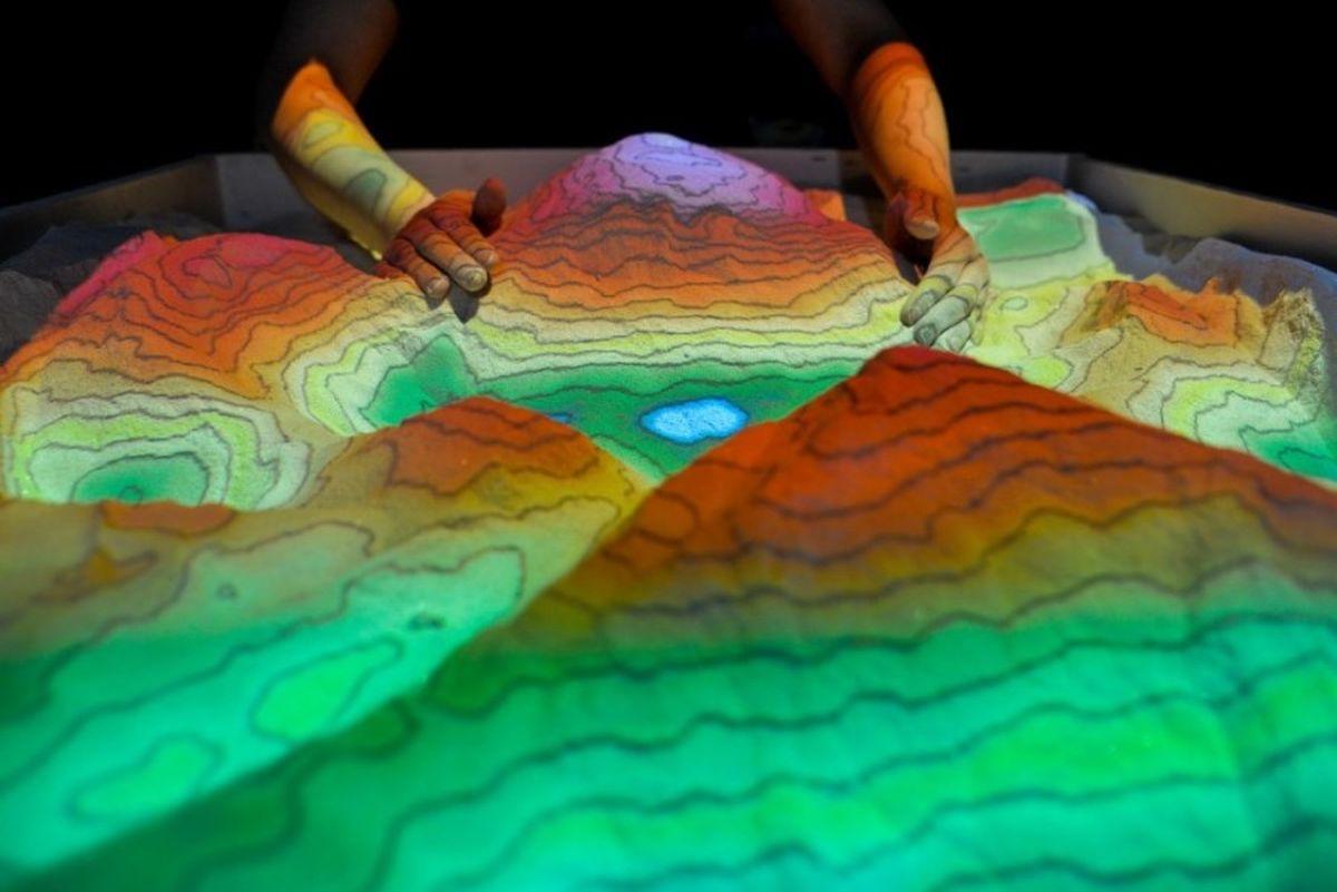 - Cómo es la mesa. La mesa topográfica es un cajón de madera con una arena muy fina parecida a la arcilla que tiene conectado un dispositivo 3D que conecta a un proyector todo esto conectado a un software libre. Entonces docentes y estudiantes con el juego de simulación se crean los relieves. Si se posiciona la mano de un determinado modo genera precipitaciones y se observa cómo el agua drena de acuerdo al relieve creado.