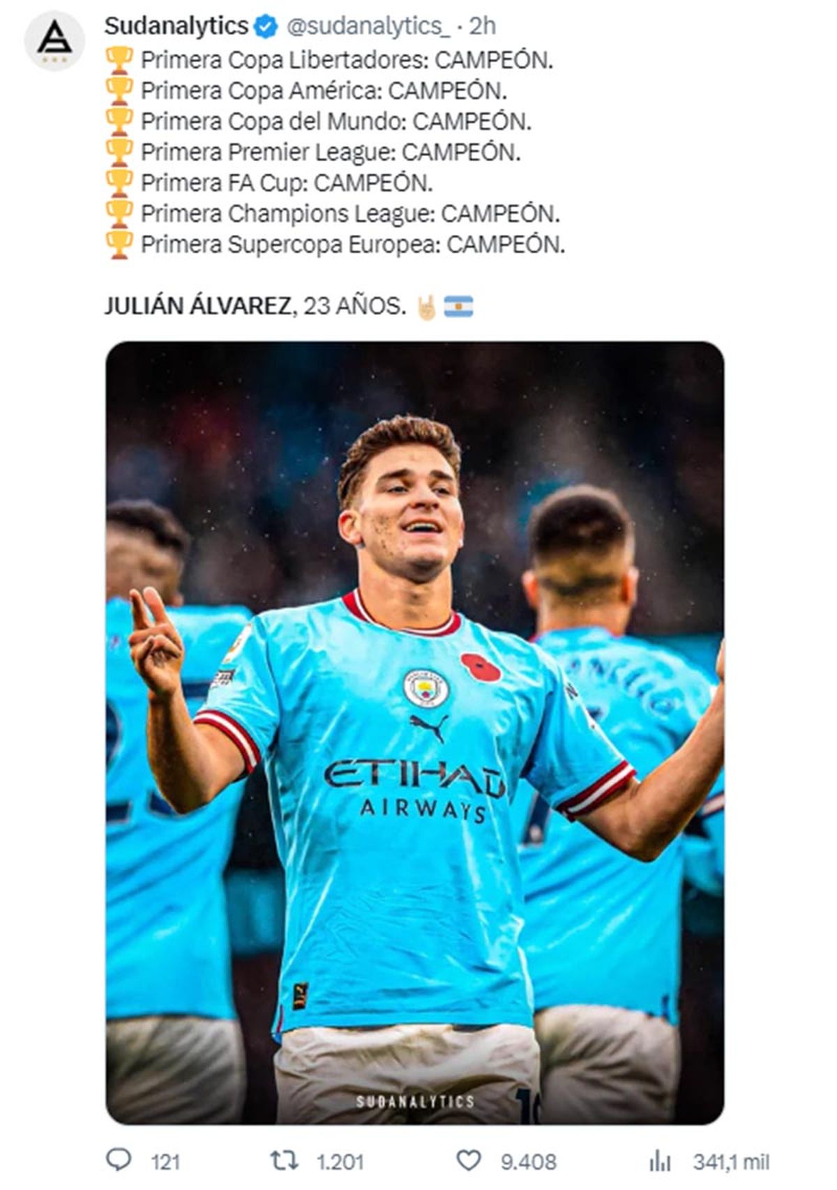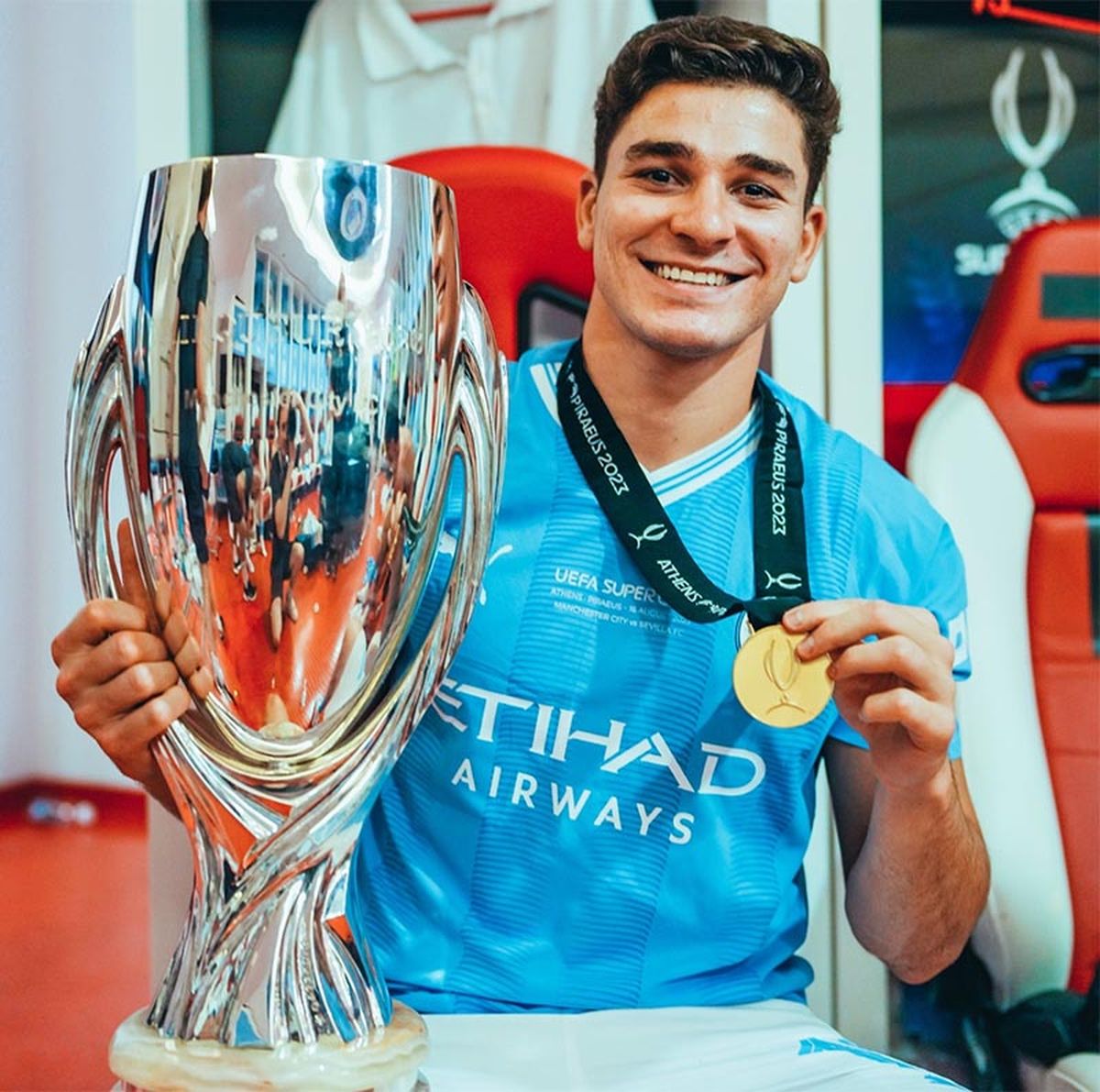 El delantero argentino Julián Álvarez se consagró campeón, junto al Manchester City, de la Supercopa de Europa en Grecia ante el Sevilla y alcanzó su título número 14 en su corta carrera donde ya ostenta una Copa del Mundo, una Copa Libertadores y una Champions League.