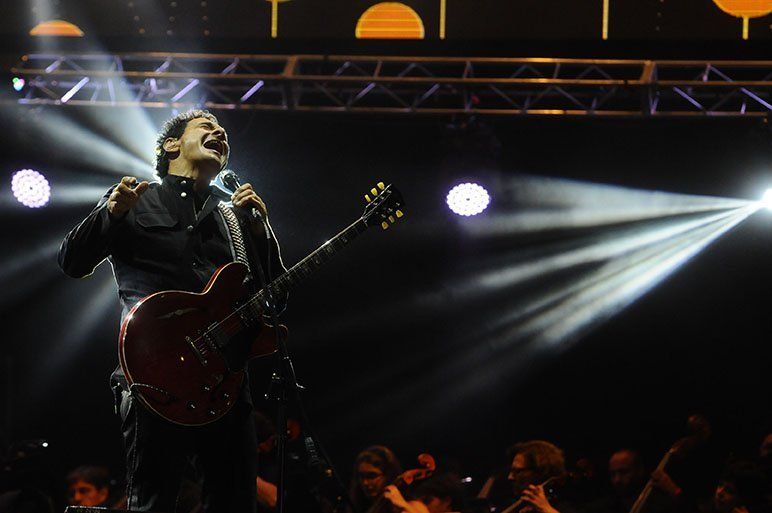 Con arreglos de Mario Galván, la Orquesta Filarmónica lo acompañó primero en su versión de Crimen, de Gustavo Cerati, y más tarde con Spaguetti del rock y Par mil. A modo de homenaje, también eligió tocar La flor azul, la chacarera compuesta por Mario Arnedo Gallo, padre de Diego Arnedo, el bajista de Divididos y cerró con Jaime Torres con La Amanecida.