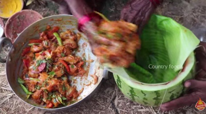 La chef cocina desde pollo en sandía frita, calabaza serpiente con huevos gigantes de emú y platos masalas.