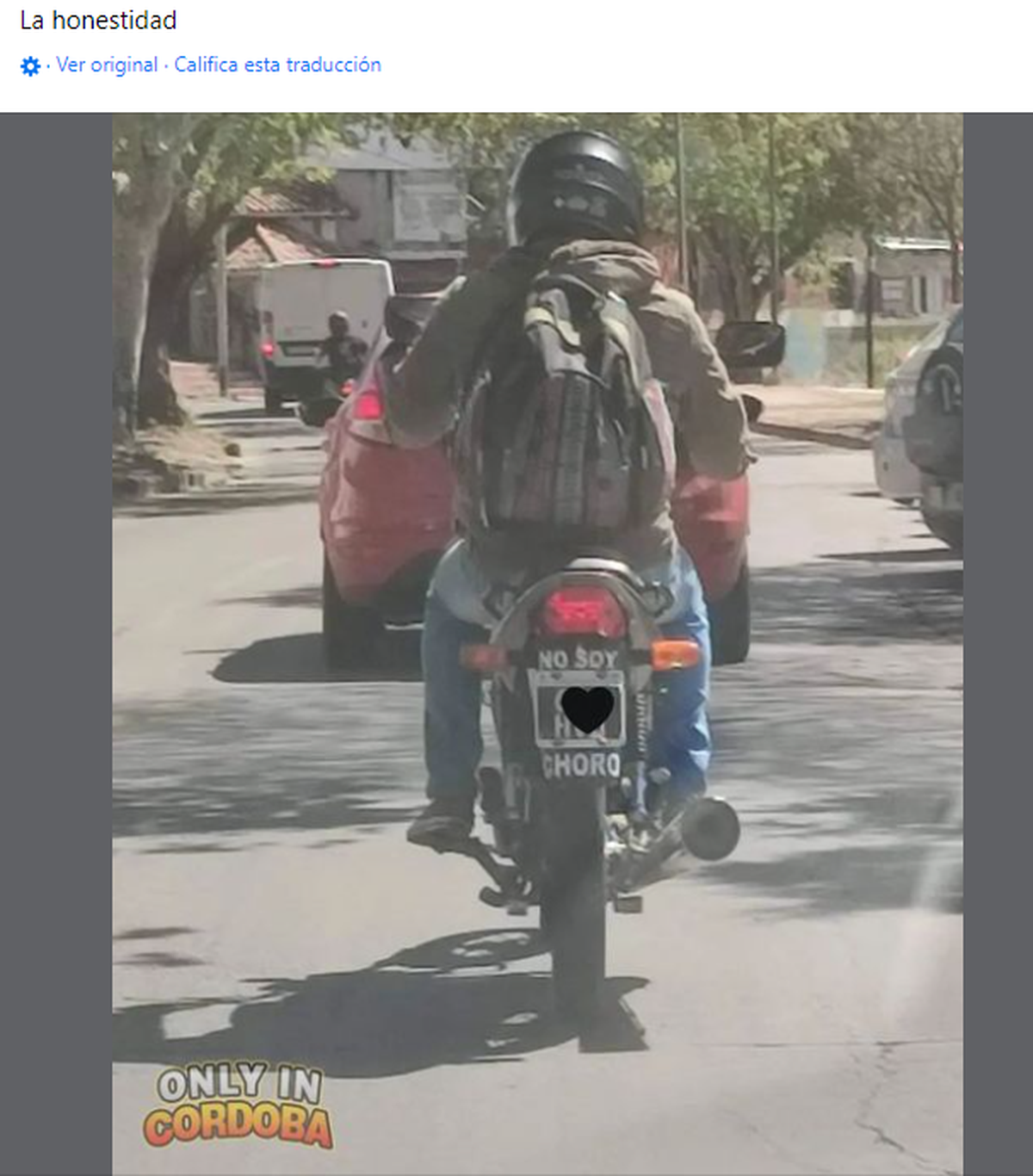 "La honestidad" destacó el perfil de Facebook de Córdoba, aplaudiendo básicamente la actitud del conductor de avisarle al resto que no se trata de uno de esos motochorros que vemos a diario en las noticias protagonizando hechos de inseguridad.