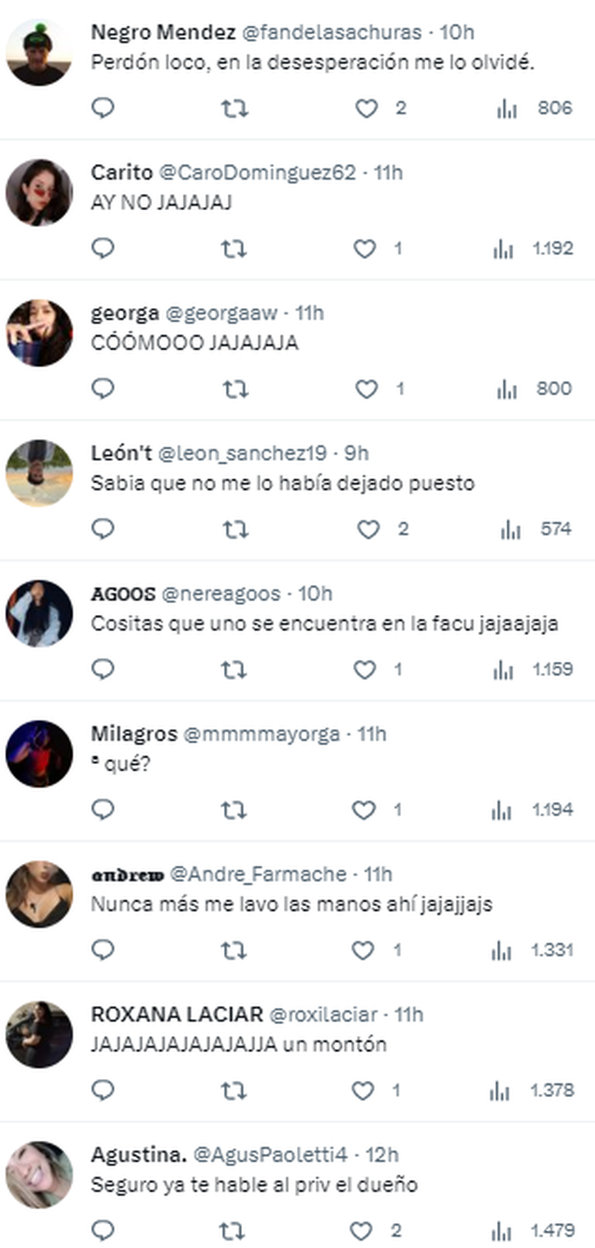 Entre los comentarios que recibió el post que alcanzó a más de 30 mil usuarios de Twitter, muchos se mostraron atónitos con la insólita escena, mientras otros aprovecharon para hacerse los graciosos y explicar que eran ellos los dueños del pene de goma.