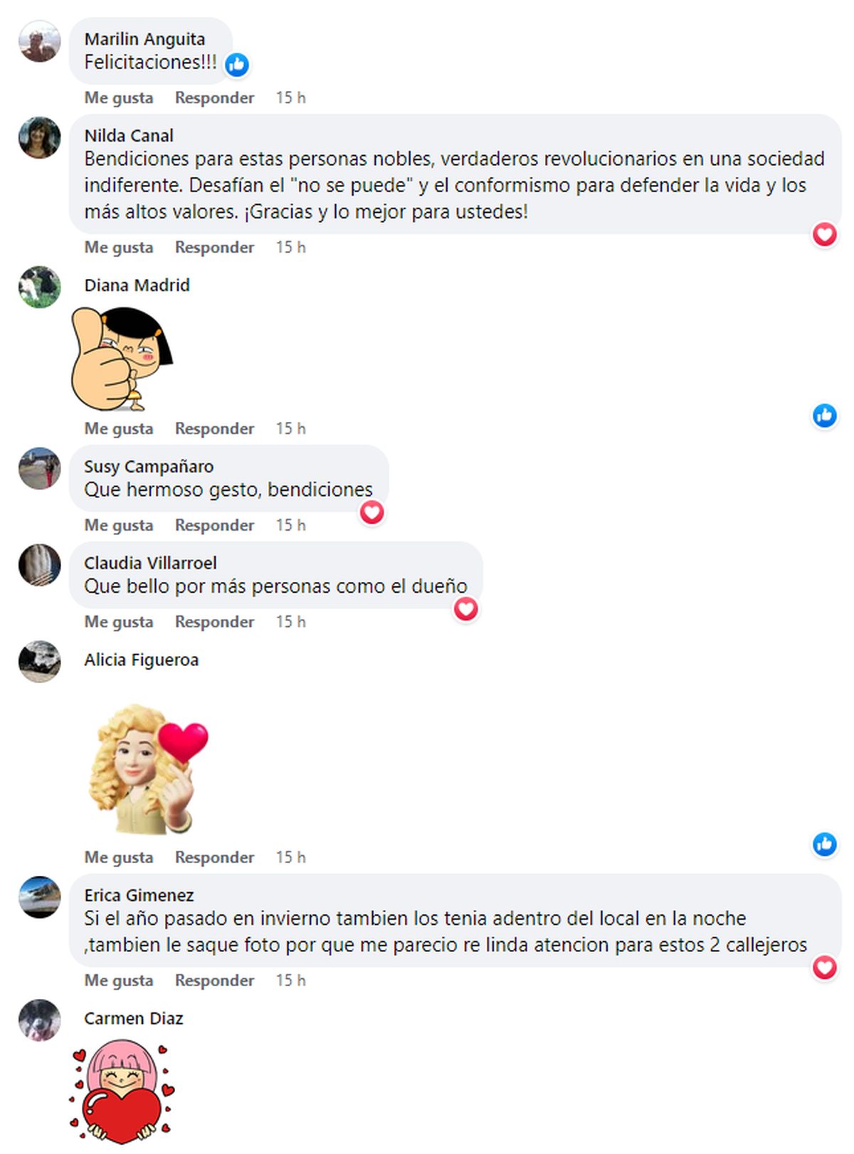 En los comentarios de Facebook, las cuentas mendocinas reconocieron a los dueños del local y dejaron un sinfín de mensajes felicitando su accionar con los perros: "Bendiciones para estas personas nobles, verdaderos revolucionarios en una sociedad indiferente".