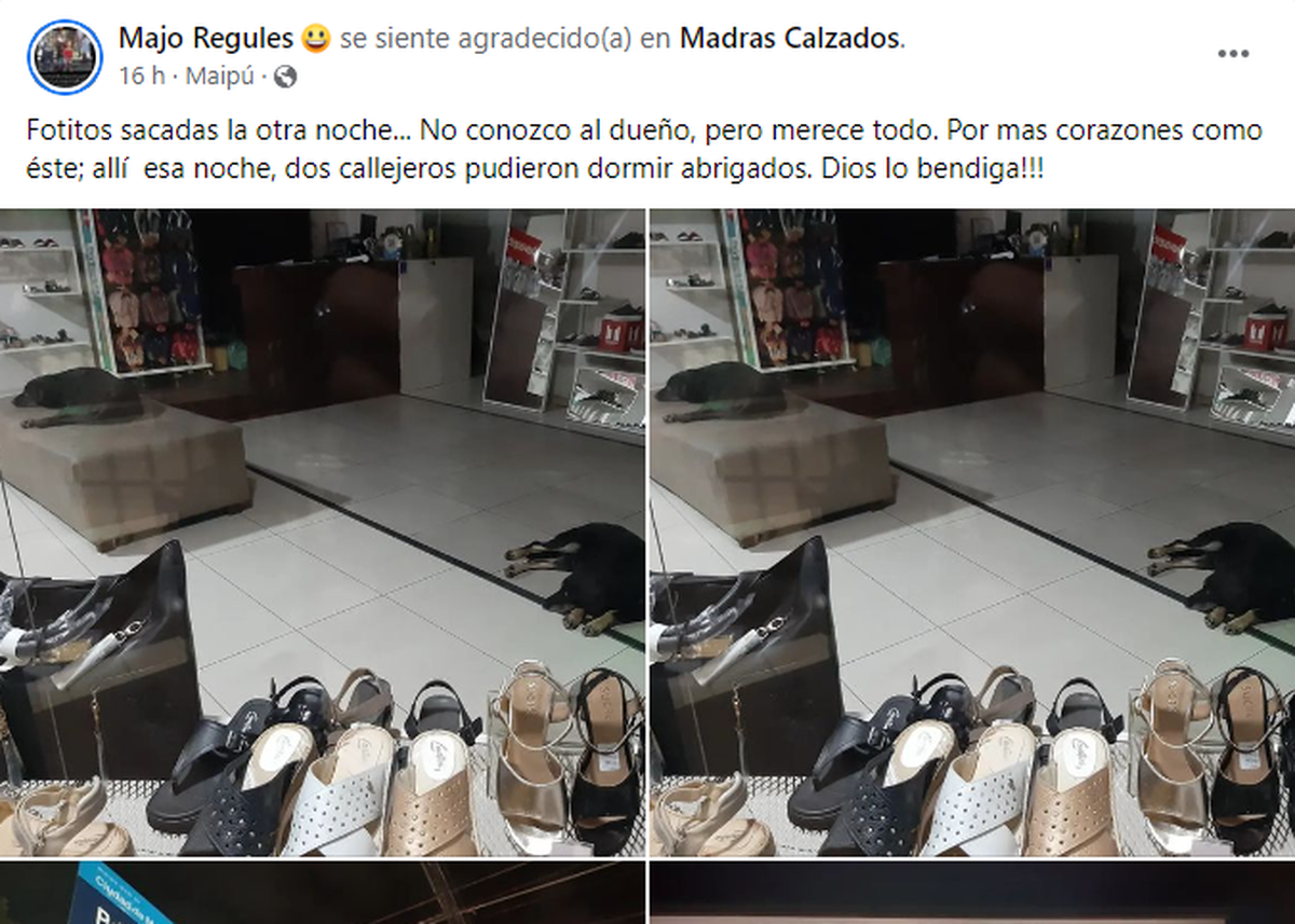 Mediante un posteo de Facebook que estalló y se hizo viral entre las cuentas de Mendoza, la usuaria Majo Regules mostró una situación con un local de zapatillas que enterneció a los locales. El sitio de Maipú le abrió las puertas a los perritos callejeros que suelen caminar por el lugar, y permitió que pasaran la noche dentro del establecimiento, resguardándolos del frío que azotaba a la provincia.