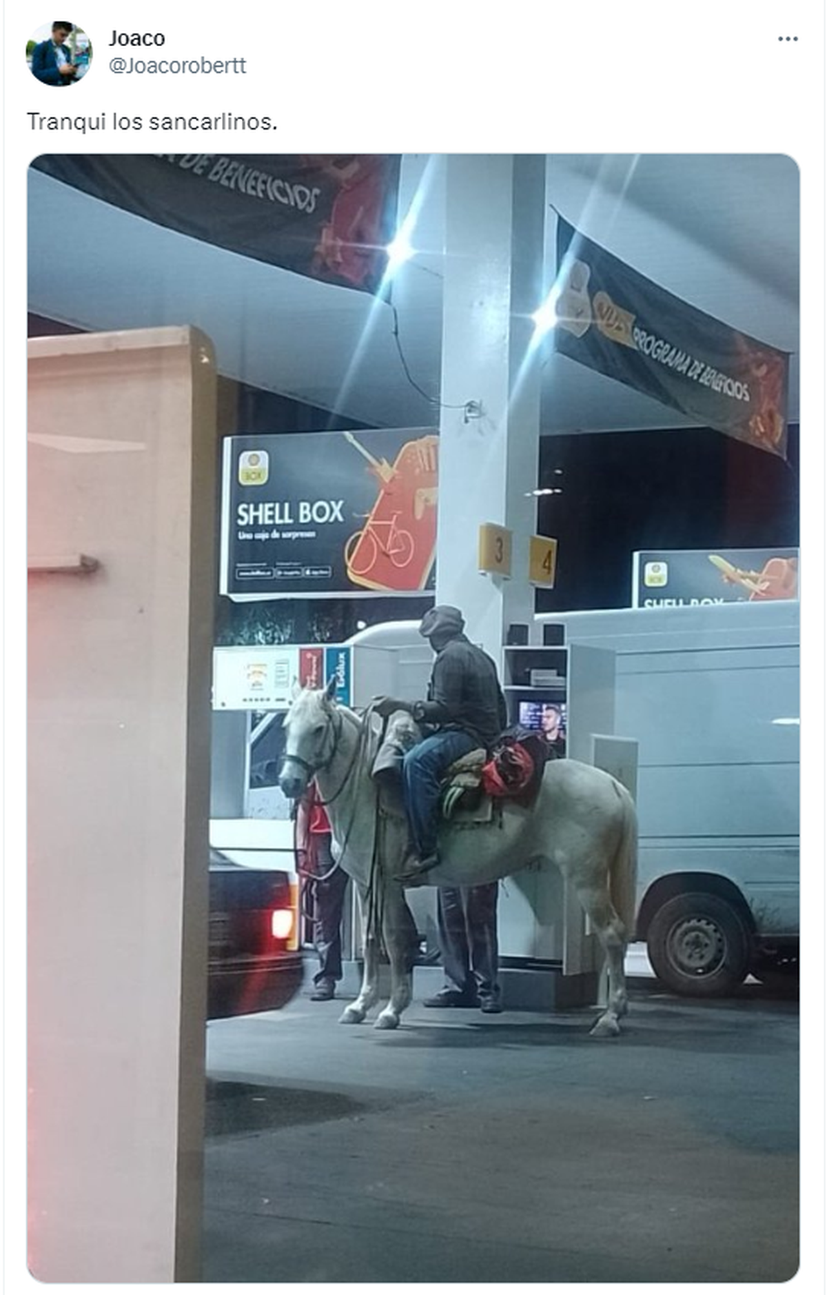Mediante una publicación que se hizo viral entre los usuarios de Twitter de Mendoza, la cuenta de Joaco Robert mostró una situación inédita en una estación de servicio de Shell del departamento de San Carlos. Entre tanto auto que esperaba para cargar combustible, un hombre se llevó la mirada de todos los presentes por estar en el lugar de carga, hablando con el playero ¡mientras estaba a caballo!