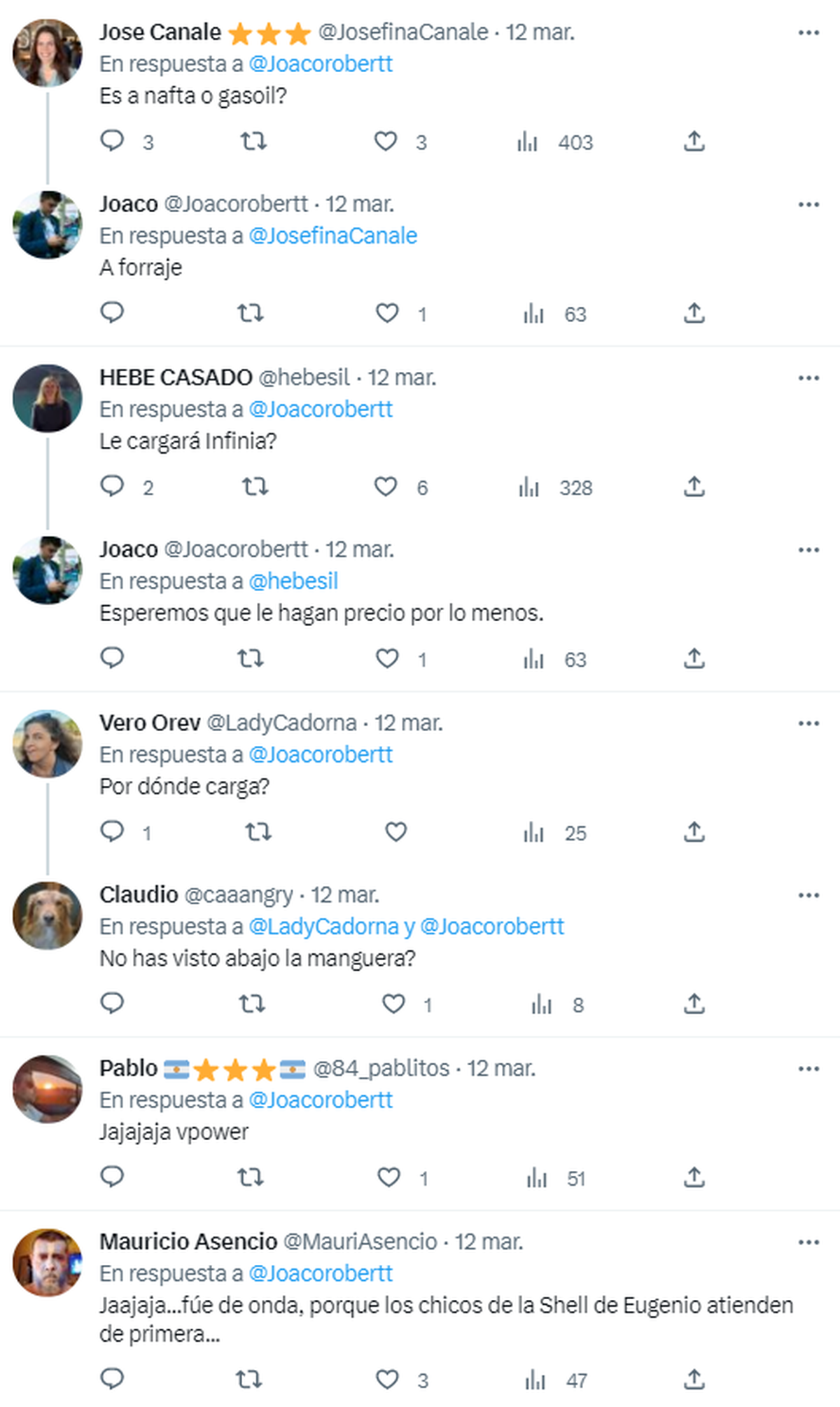Entre los comentarios por lo ocurrido en Mendoza, fueron varios los usuarios que se preguntaron si "había pasado la RTO", mientras otros consultaban por el tipo de combustible que recibía: "¿Infinia, super o equina?".