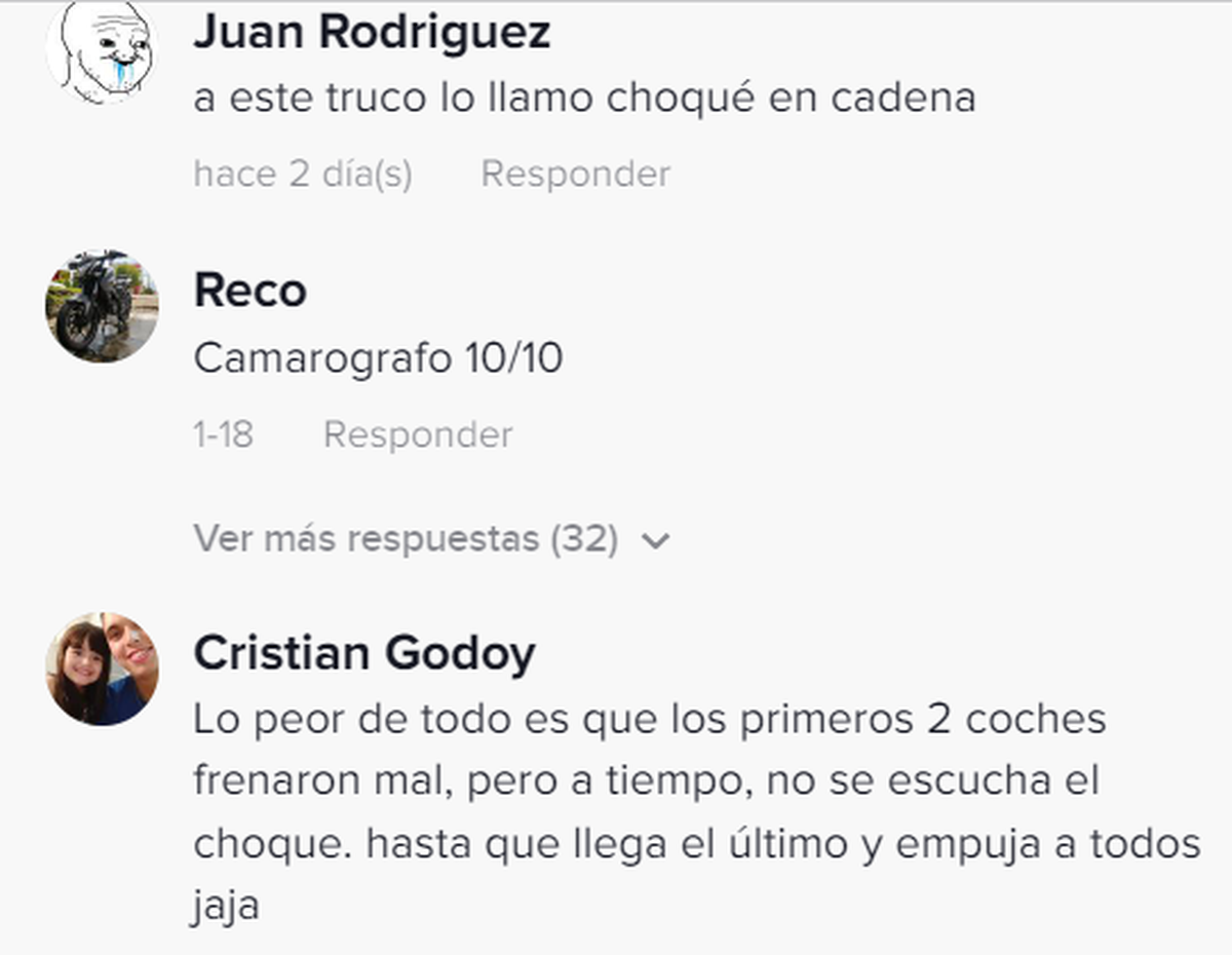 Los tres autos involucrados parecen ser dos Renault, que es uno de ellos quien frena de golpe, y dos Fiat Siena, que no logran reaccionar a tiempo por la velocidad a la que iban. Los usuarios dejaron comentarios burlándose de lo ocurrido, asegurando que se frenaron "para enseñarle un truco".