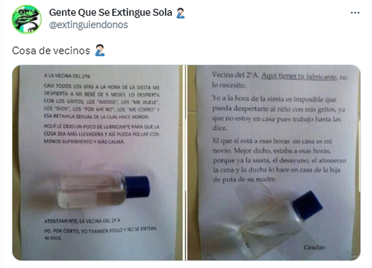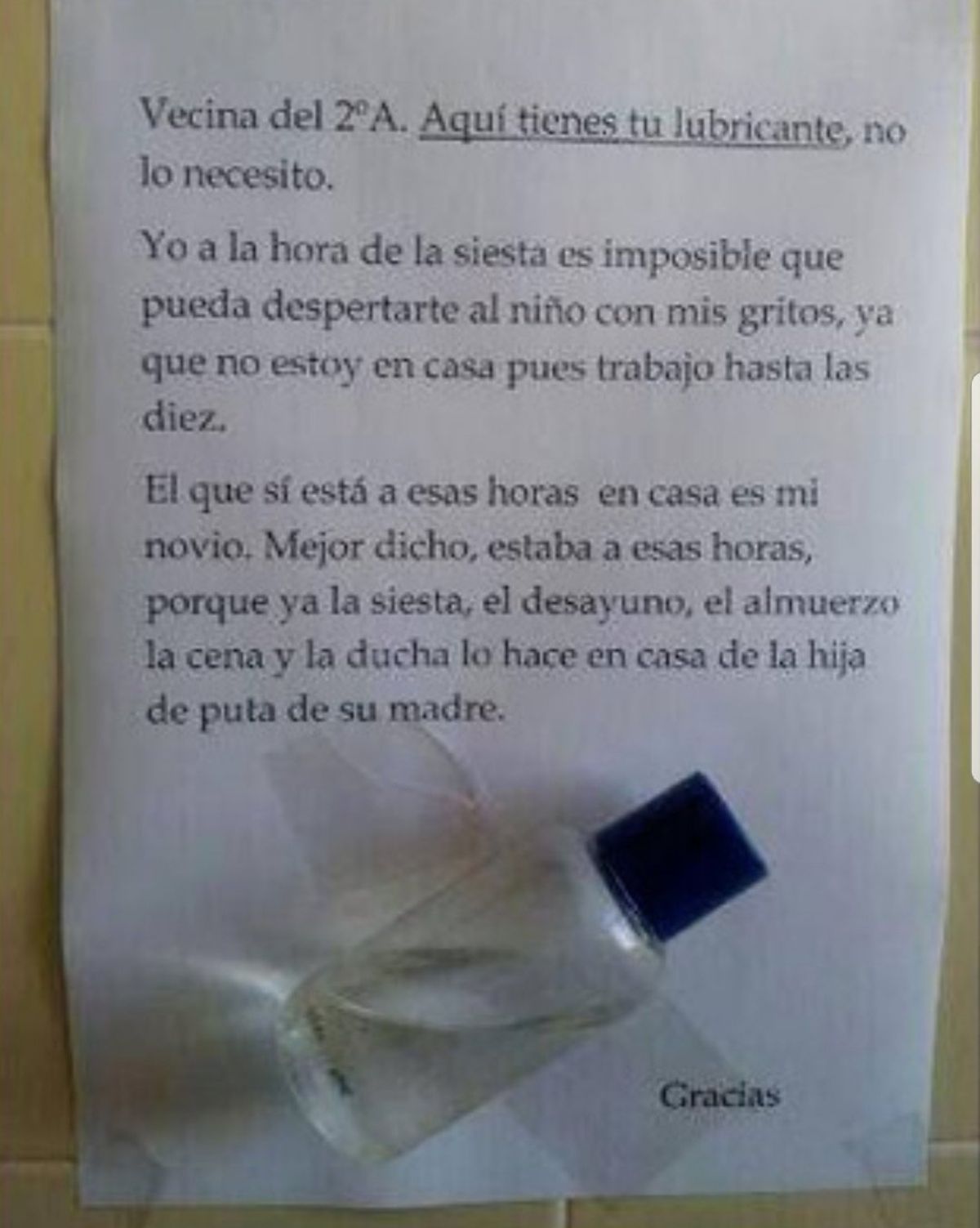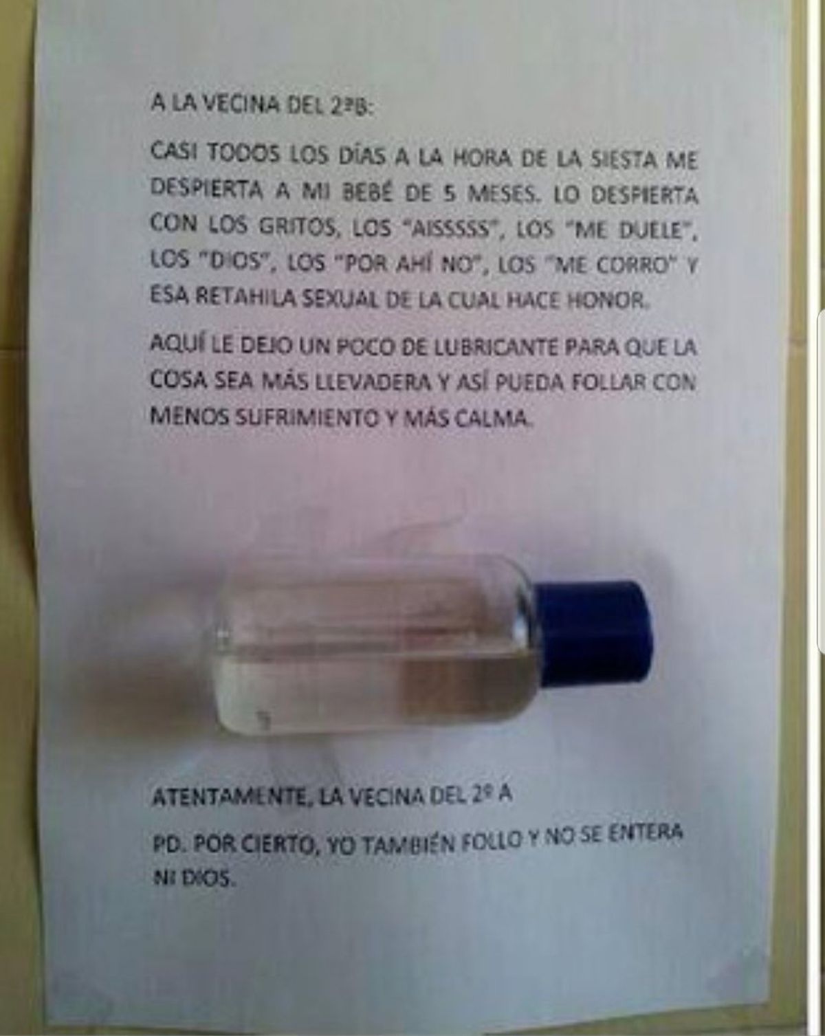 "A la vecina del 298: casi todos los dias a la hora de la siesta me despierta a mi bebe de 5 meses. Lo despierta con los gritos, los "aisssss", los "me duele", los "dios", los "por ahi no", los "me corro" y esa retahila sexual de la cual hace honor. Aquí le dejo un poco de lubricante para que la cosa sea más llevadera y así pueda follar con menos sufrimiento y más calma atentamente, la vecina del 29 a pd. Por cierto, yo tambien follo y no se entera ni dios" dejó escrito la dueña.