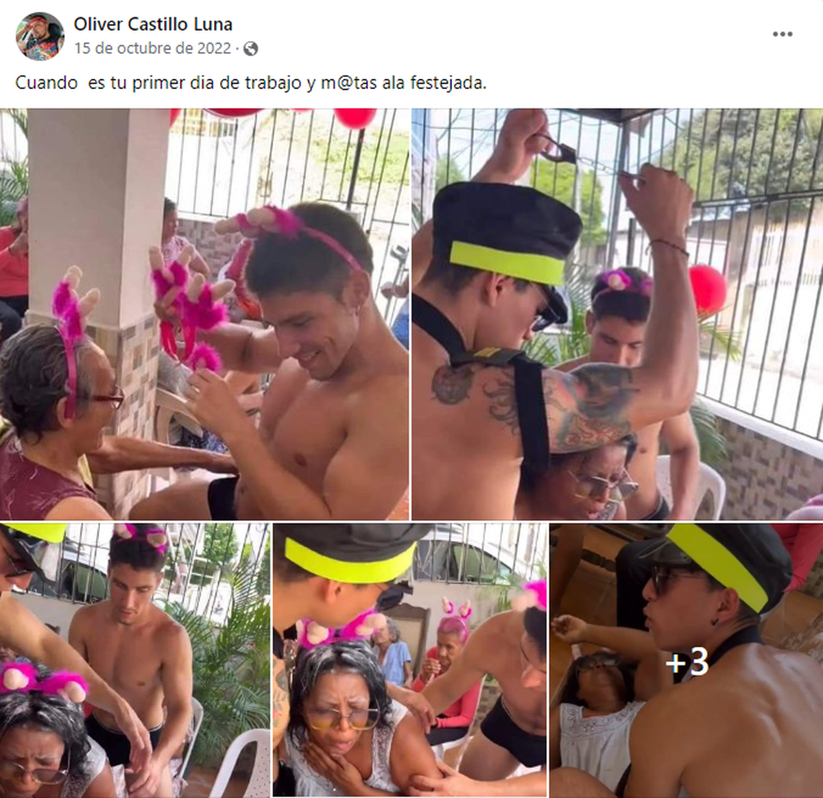 Una mujer protagonizó un hecho que se hizo viral en Facebook, tras compartirse fotos de como un par de strip tease le están bailando, mientras ella estaba sentada en una silla. La situación generó gran revuelo cuando en una de las imágenes se ve como la protagonista empieza a infartarse, a tal punto que se la llevaron en la camilla.