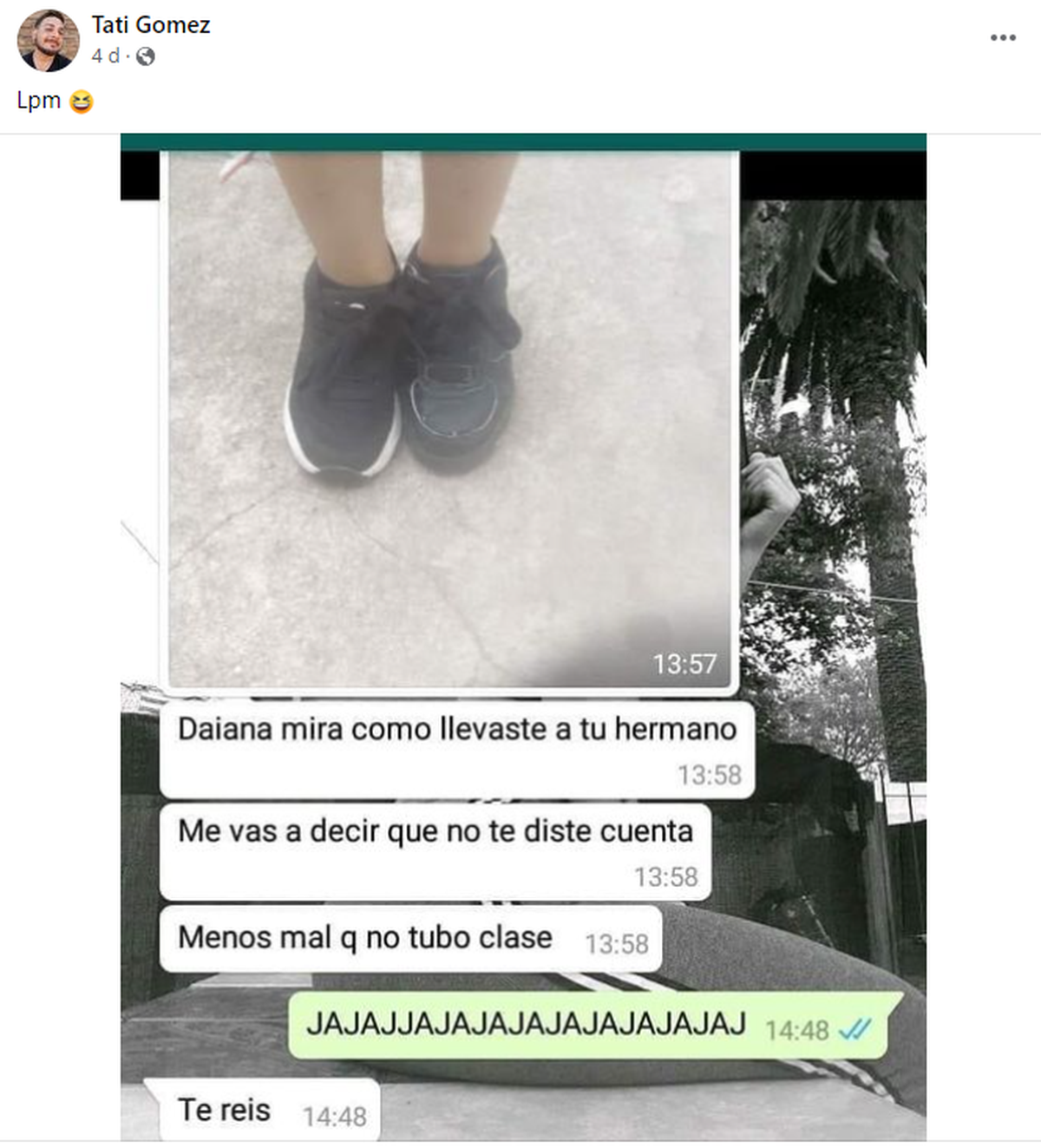 En la publicación de Facebook viral, que llegó a recolectar más de 10 mil compartidas, se ve una captura de WhatsApp con su mamá que estaba atónita por la escena con la que se encontró con su hermanito, al que mandó al colegio con dos zapatillas diferentes: "Mirá como llevaste a tu hermano ¿Me vas a decir que no te diste cuenta? Menos mal que no tuvo clase".