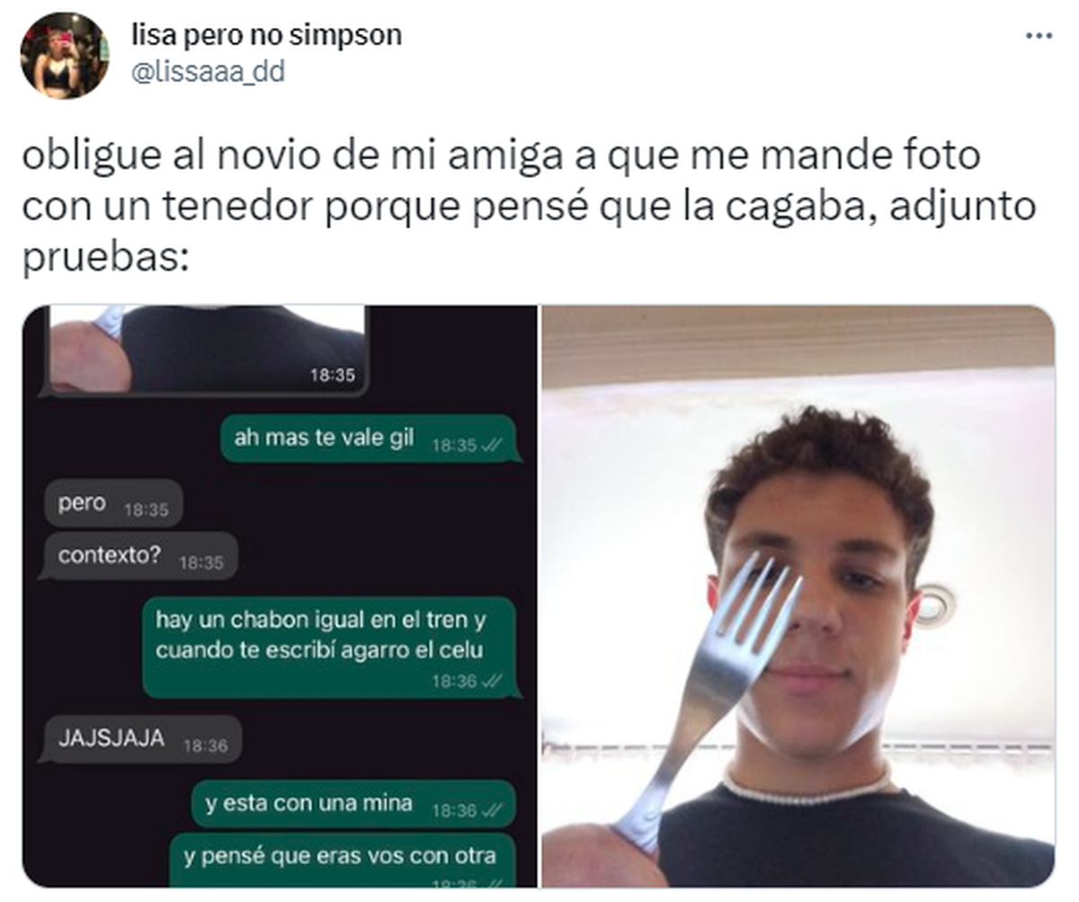 Mediante una publicación que se hizo viral en Twitter, la usuaria Lisa pero no de Simpson comenzó a recorrer el inicio de las demás cuentas con una "historia graciosa" que tuvo con el novio de su amiga. Tras pensar que lo había visto con otra, le pidió una foto en el momento, con un tenedor en la mano para corroborar que no le estaban siendo infiel a su amiga, aunque ella terminó siendo catalogada como "tóxica".